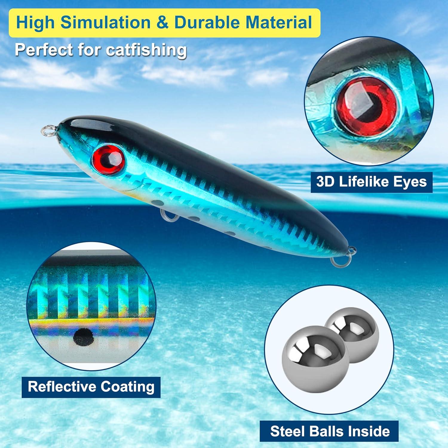 【Catfish Rattling Line Float Lures】Equipped with 3D lifelike eyes, bright vibrant catfish floats and rattle noise, it attacks the catfish's soft spot from the visual and auditory senses, which attract fish as the swim up and down the water looking for their next meal