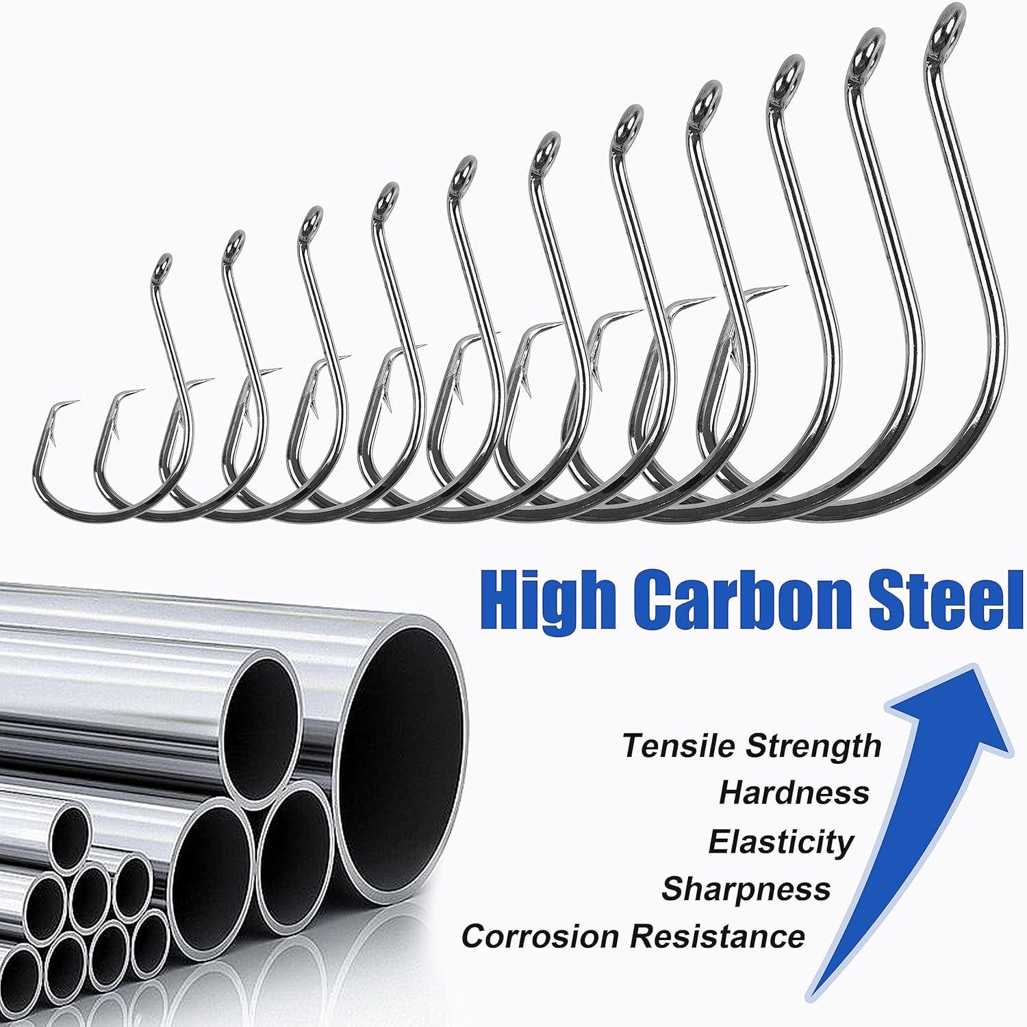 ๐ STRONG & DURABLE: Made of high carbon steel with black nickel plated, the offset circle hooks have high strength and corrosion resistance for saltwater fishing.