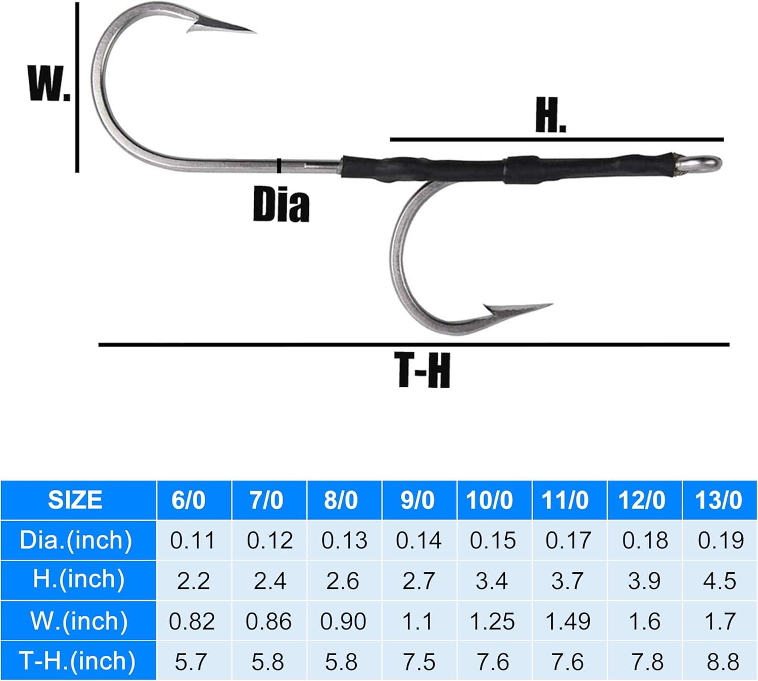 【WHAT YOU GET】3pcs Saltwater Double Hook Rigs for Trolling and Chunking. Optional Sizes: 6/0, 7/0, 8/0, 9/0, 10/0, 11/0, 12/0, 13/0. Wishing you a a good catch!
