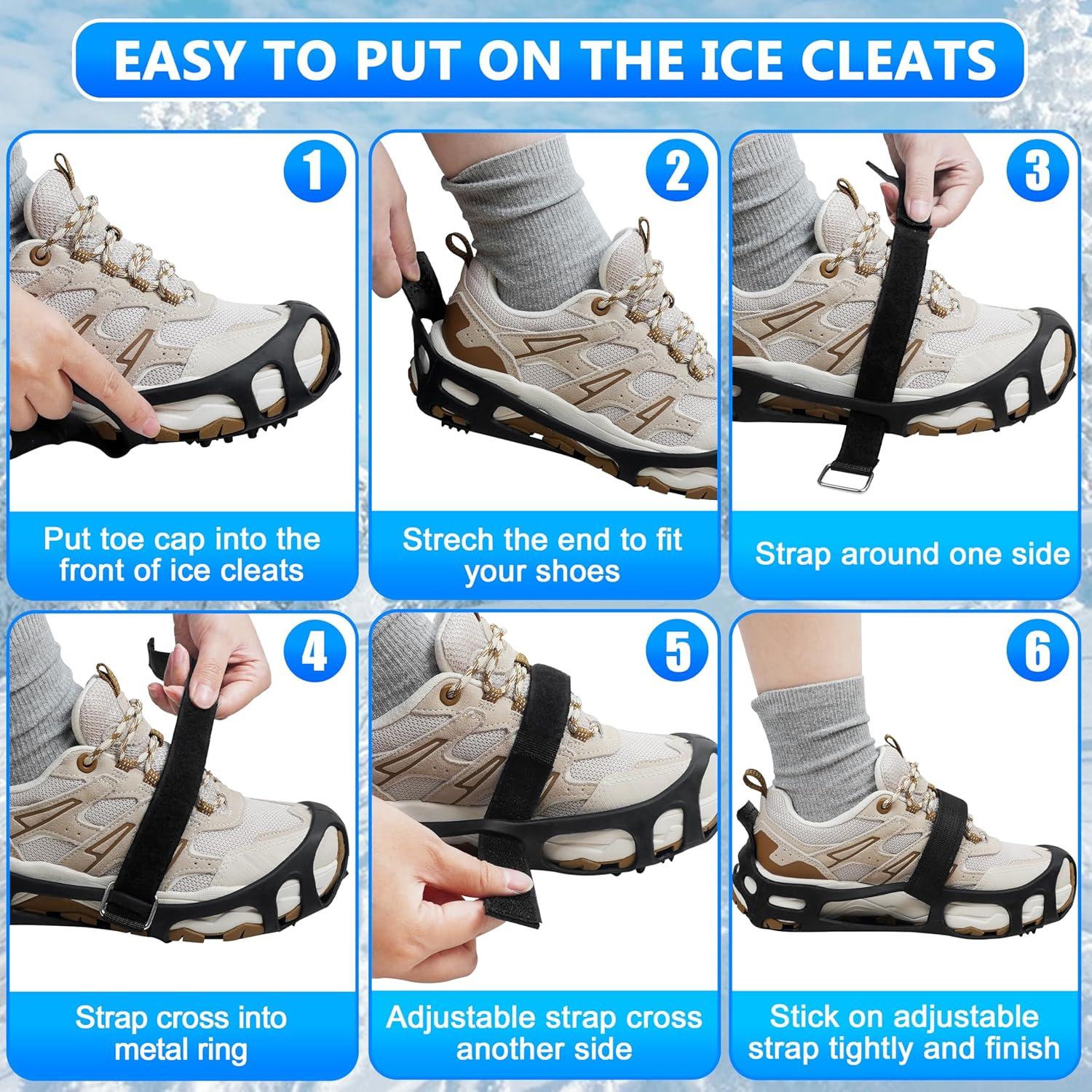 【EASY TO USE】You just need to slide the front of the shoes to the cleats and stretch the cleats to the heel of your shoes, then adjust the tightness as you need. The addition of adjustable straps make the traction more stable on the footwear, especially for customers with thin feet.
