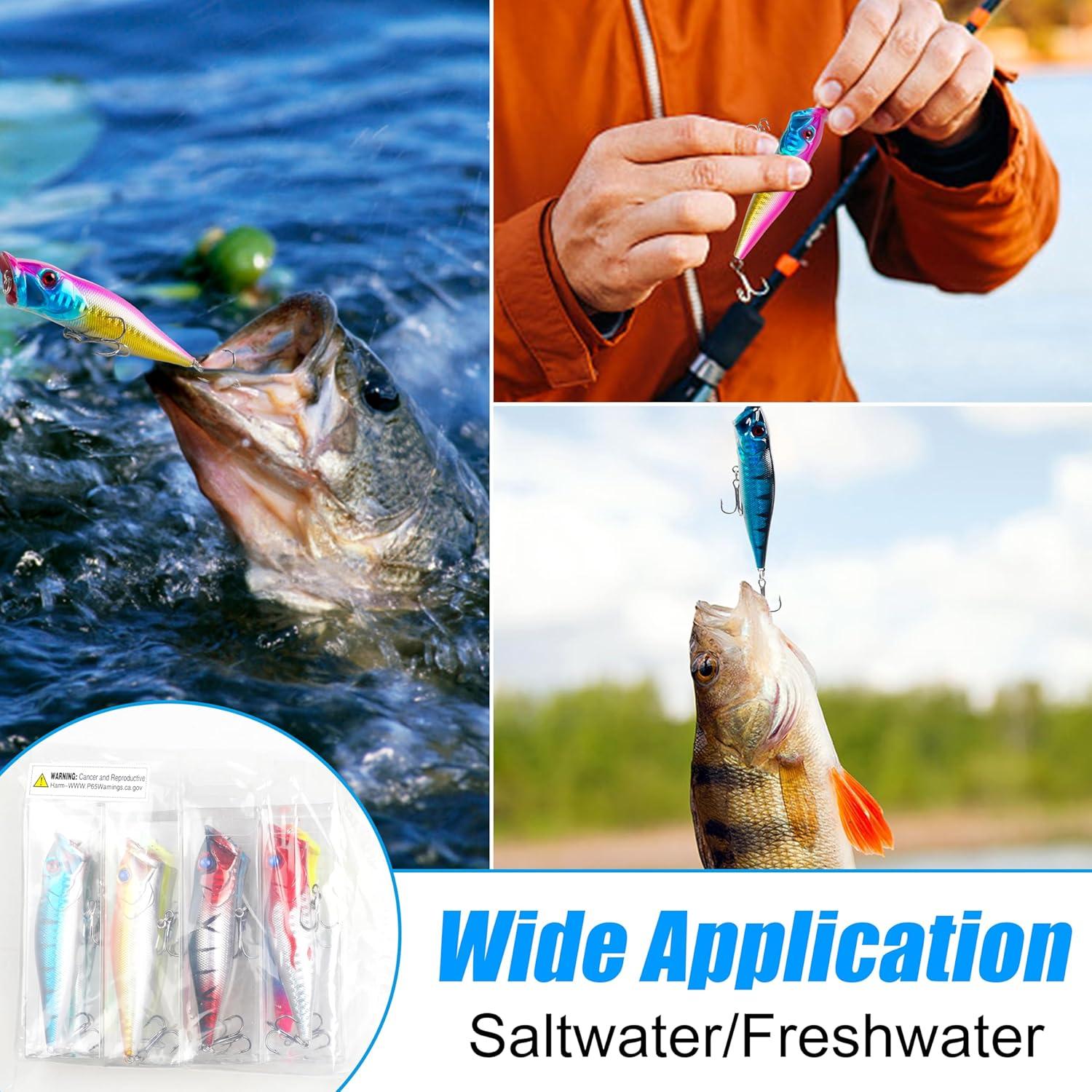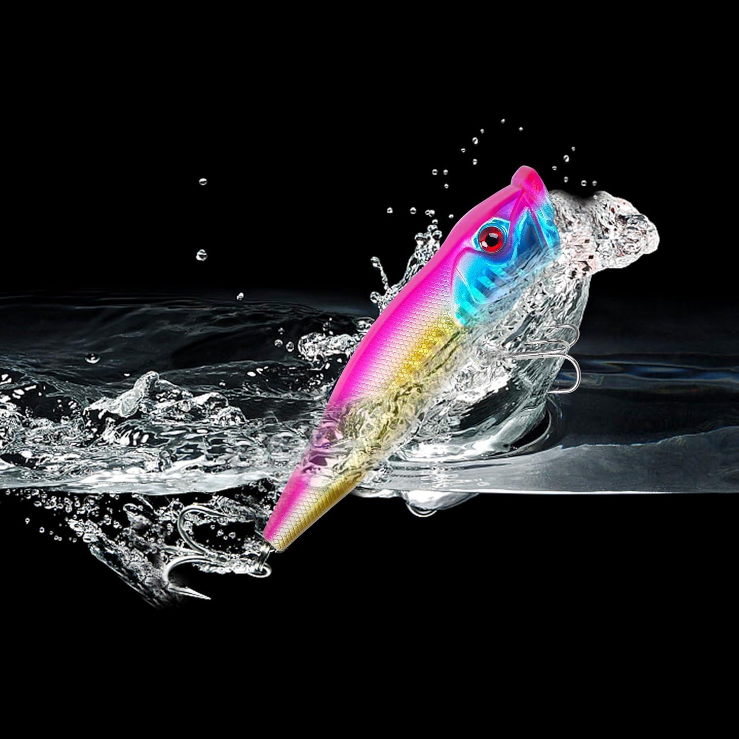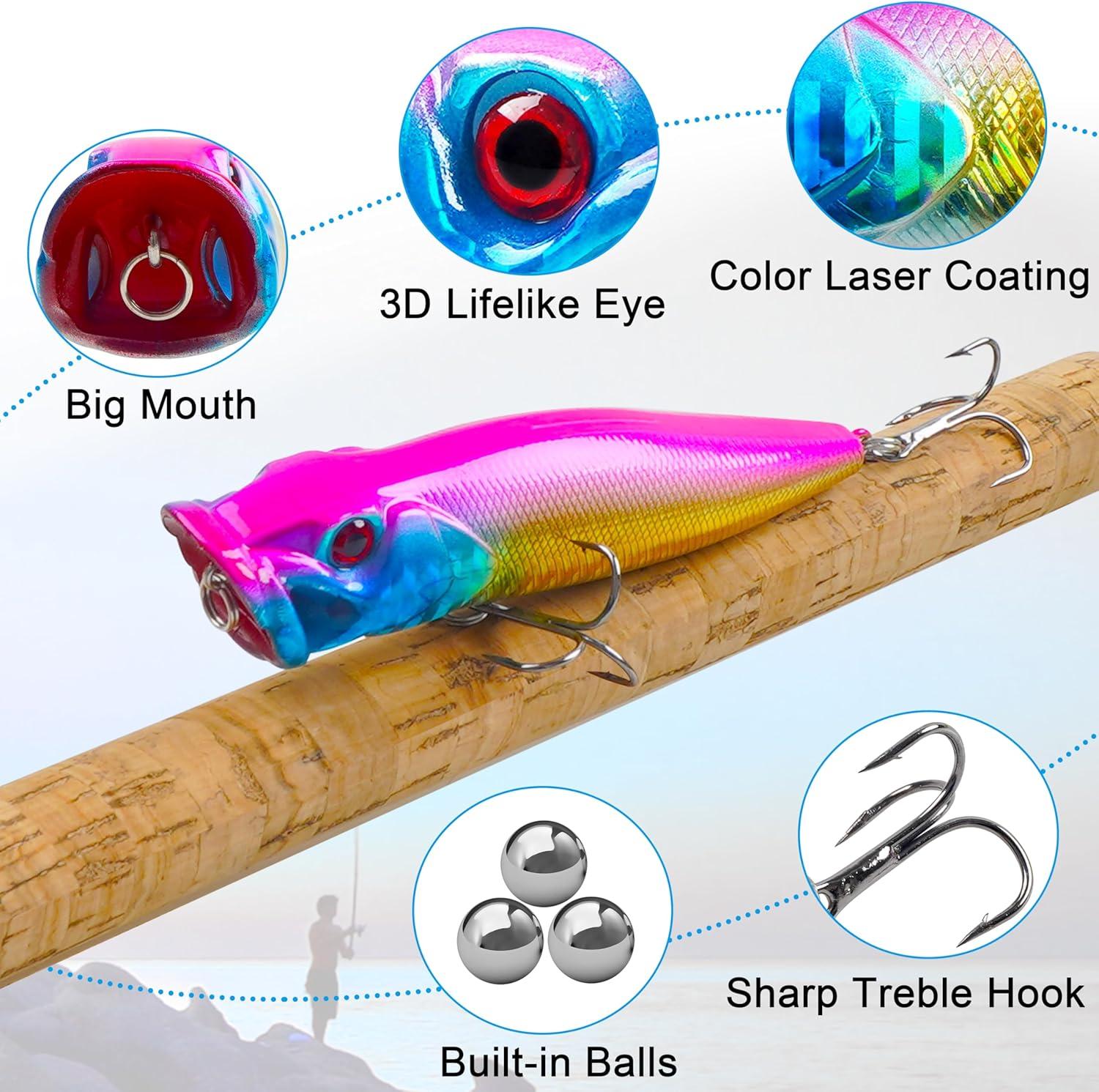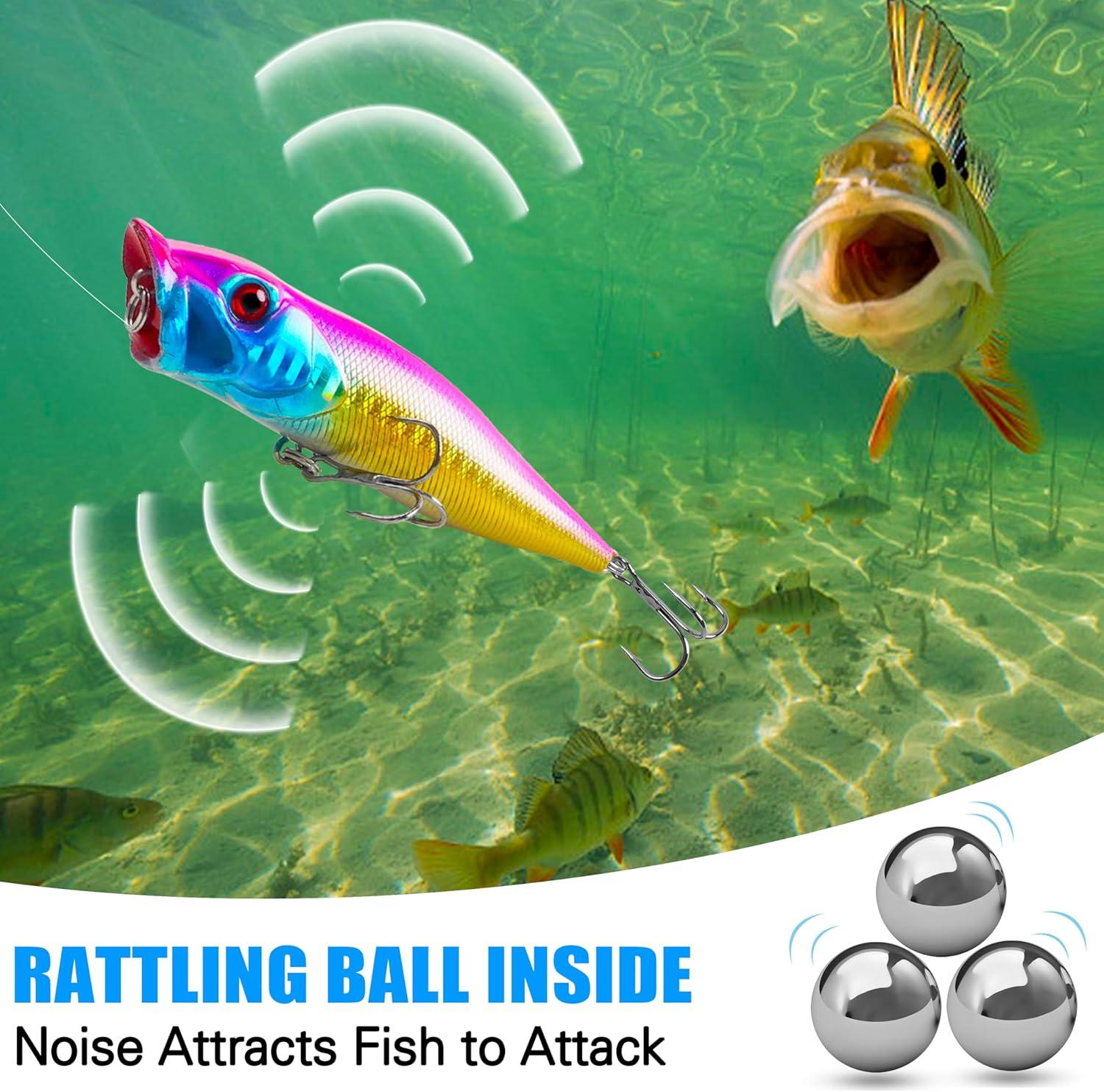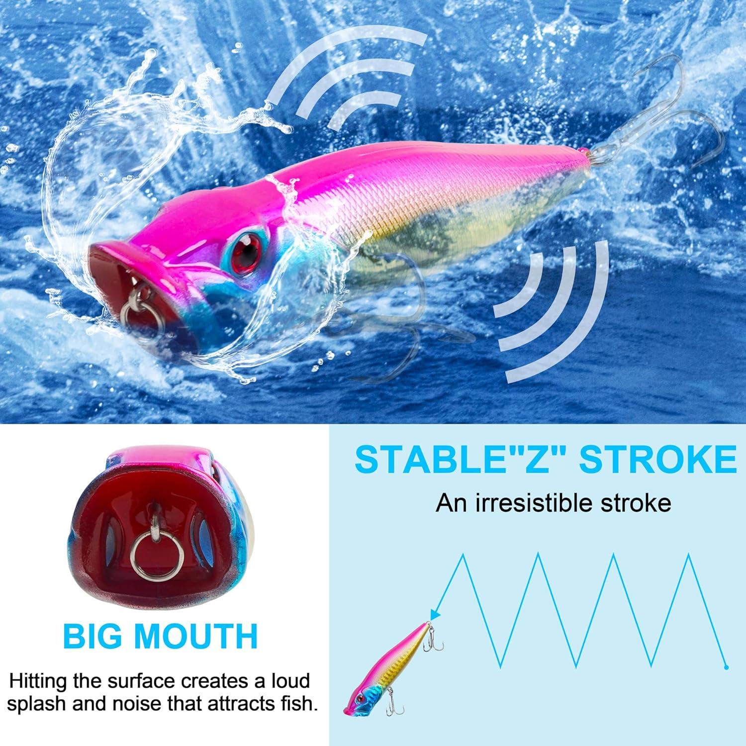 【Sharp Treble Hook】Each popper lure equipped with 2 treble hooks that are durable, corrosion-resistant and have a strong piercing ability, making it easy to catch fish and prevent them from escaping