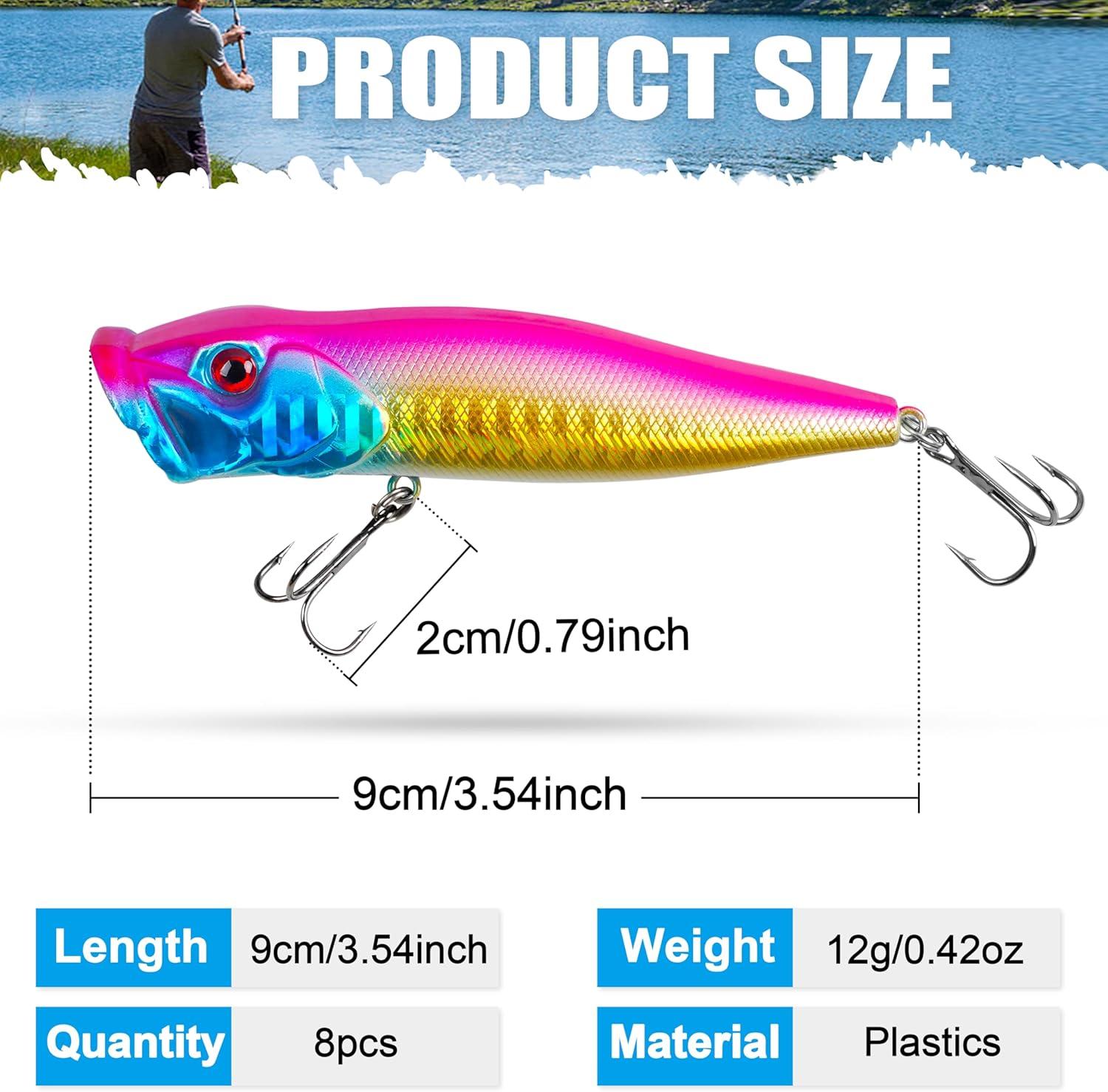 【8Pcs Popper Lures】8 bright colors floating bass fishing lures in one set, length: 3.5inch, weight: 0.43oz. Widely used for catching all kinds of pelagic fishes, such as bass, panfish, crappie, pike, muskie, perch, walleye, tuna, freshwater and saltwater