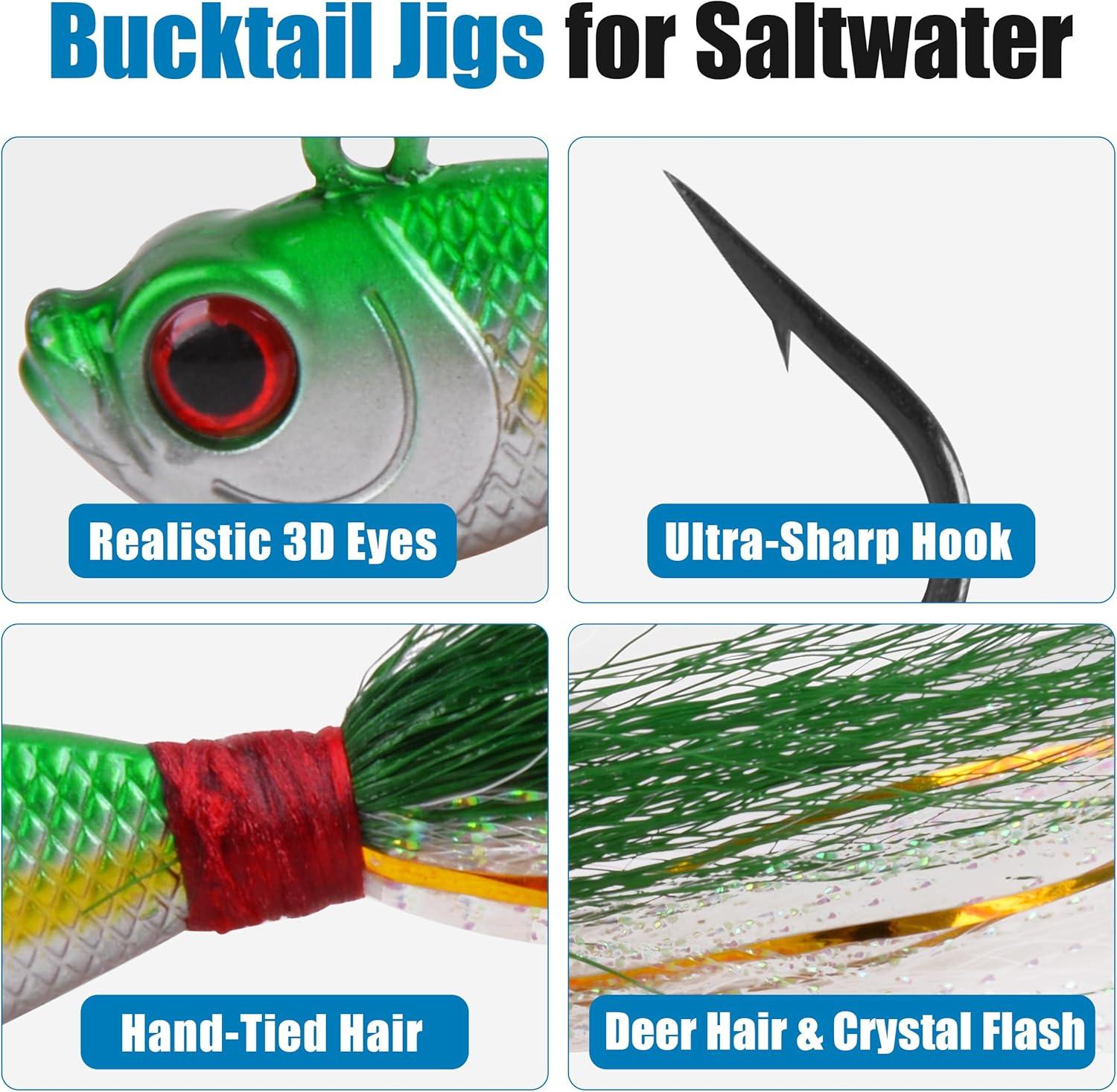 【Size & Quantity】OROOTL 5 Pack Saltwater Fishing Jig Lures. Select from 1/4 oz, 1/2 oz, 1 oz, 3/2 oz, 2 oz, optional 5 colors. The Bucktail Hair Jigs have a wide variety of applications in both saltwater and freshwater.