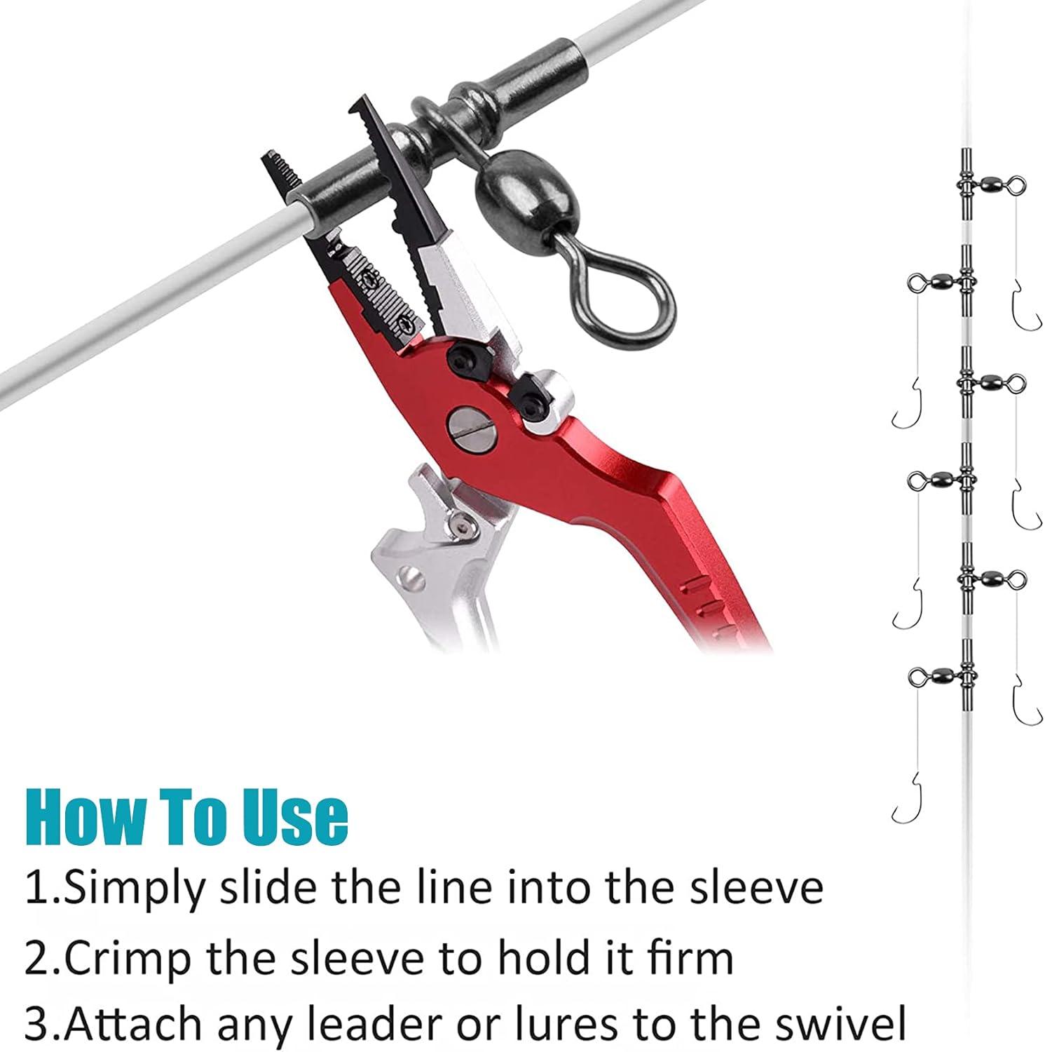 EASY TO USE: Simply slide the sleeve onto your trace and crimp the sleeve to hold it in position. Then attach any sort of leader you want to the cross line swivel to attach your hooks