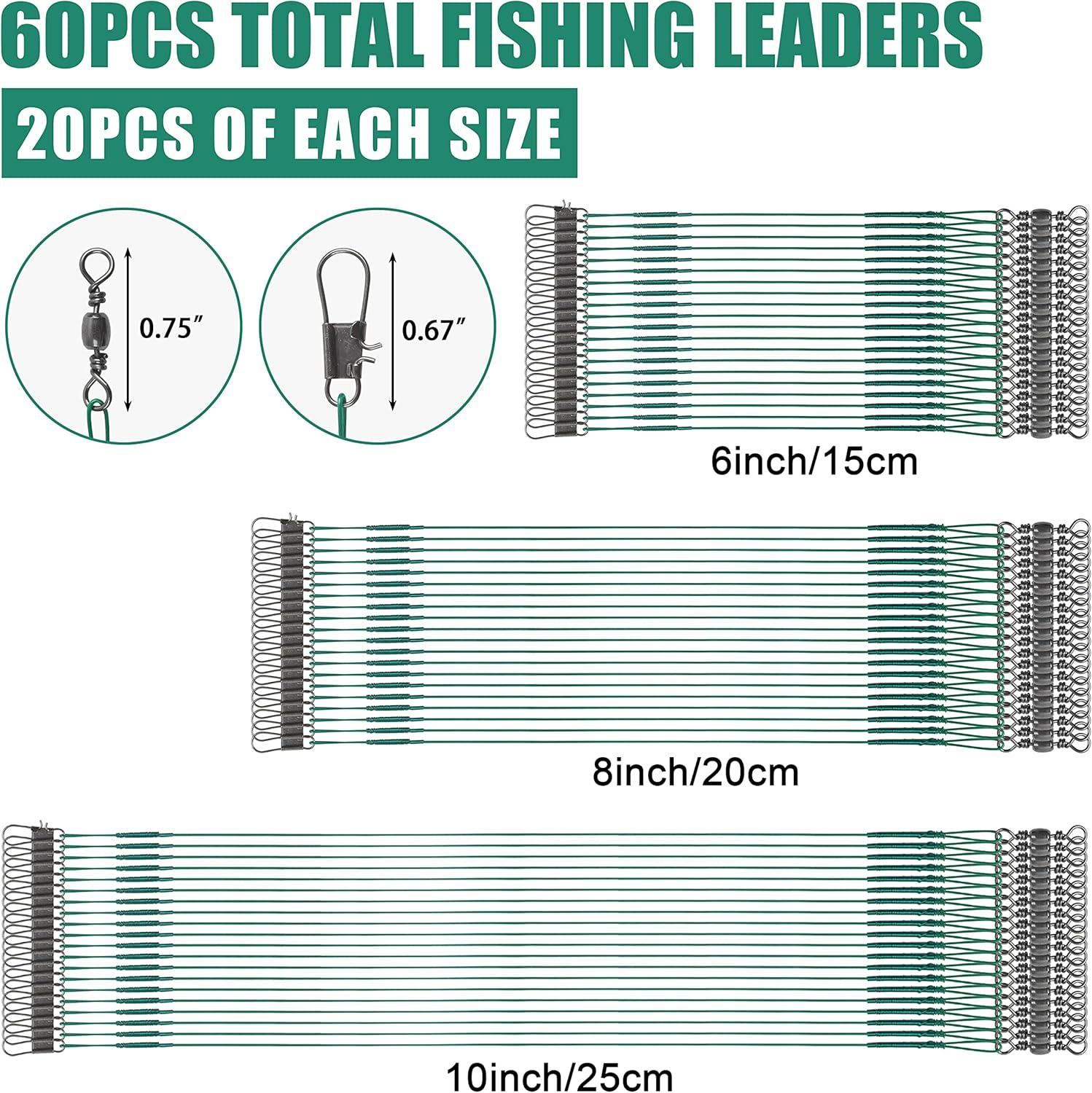 【FISHING LEADERS KIT】Including 60pcs fishing wire leaders, 20pcs/size, 6inch(15cm), 8inch(20cm), 10inch(25cm). Diameter: 0.02inch. Test: 13KG/29LB. Color: green / black / silver. Each length bundled together, it's easy to get individual leaders out to use.
