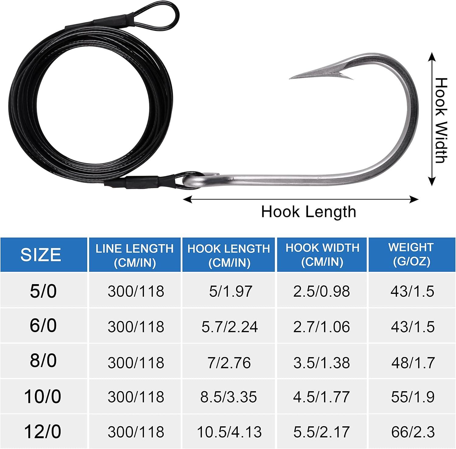 【HEAVY DUTY FISHING RIGS】The fishing shark hook rigs equipped with 400LB nylon coated stainless steel cable wire leader. Wire leader length: 1.8m(9.8ft). Hook size: 5/0, 6/0, 8/0, 10/0, 12/0.