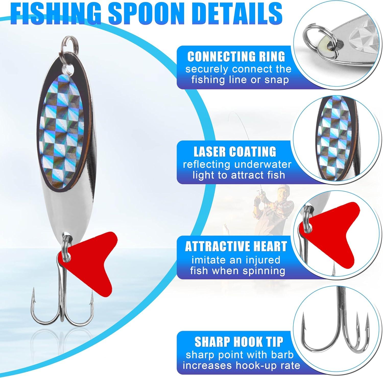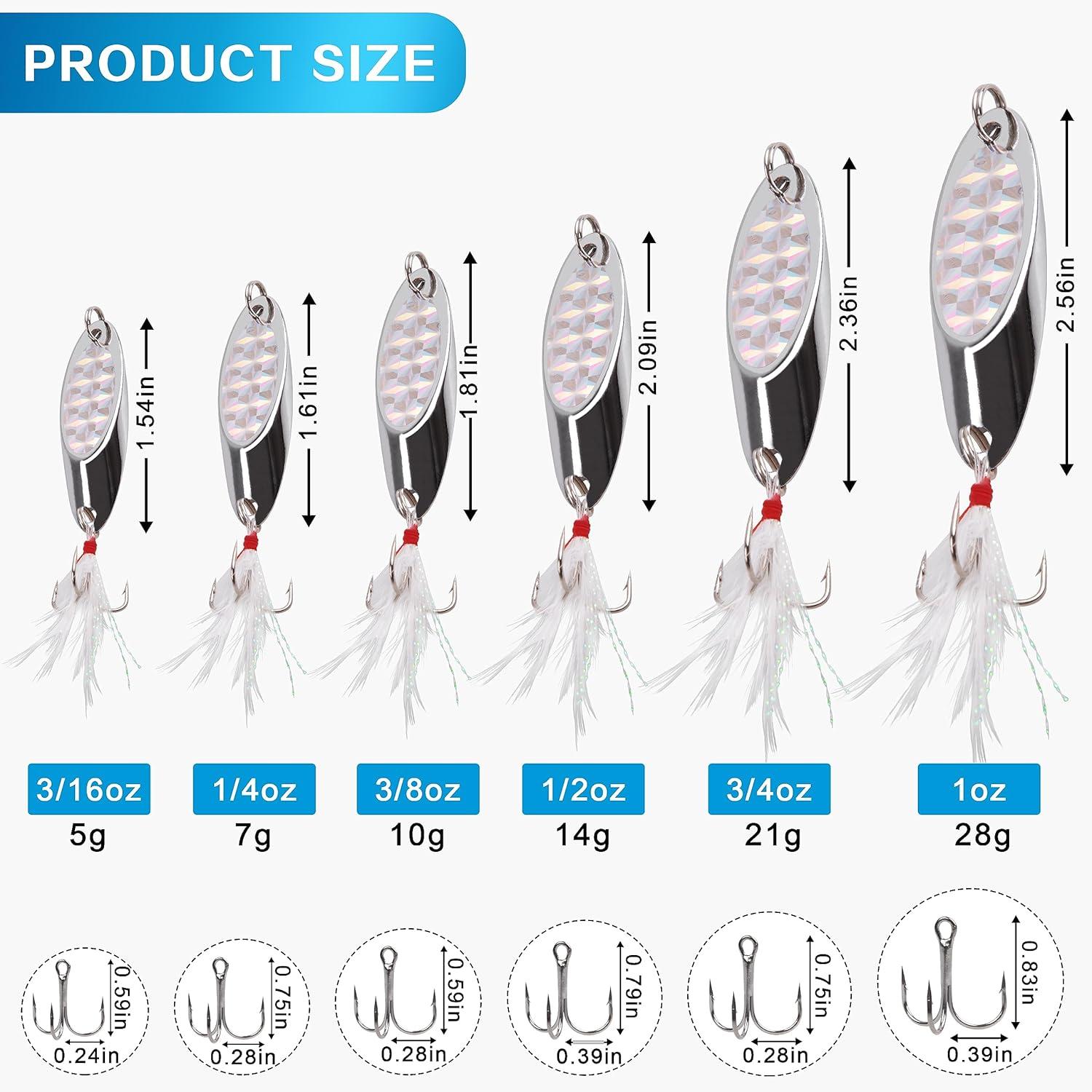 【WIDE APPLICATION】The fishing spoon lure is deal for freshwater and saltwater fishing. Great for catching bass, bluefish, walleye, Pike, devils, Catfish, cobia, stripers, snook and so on. Available Size: 1oz(28g), 3/4oz(21g), 1/2oz(14g), 1/4oz(7g), 3/16oz(5g).