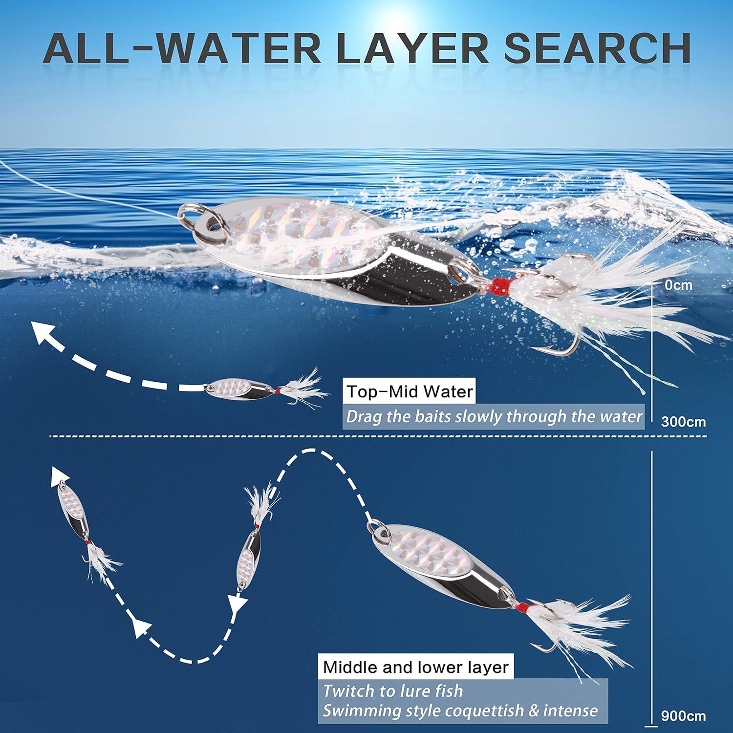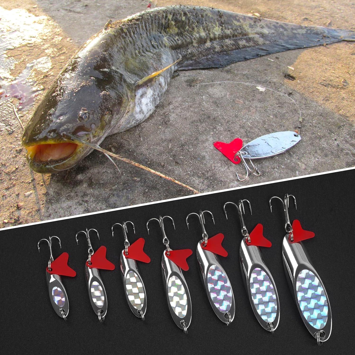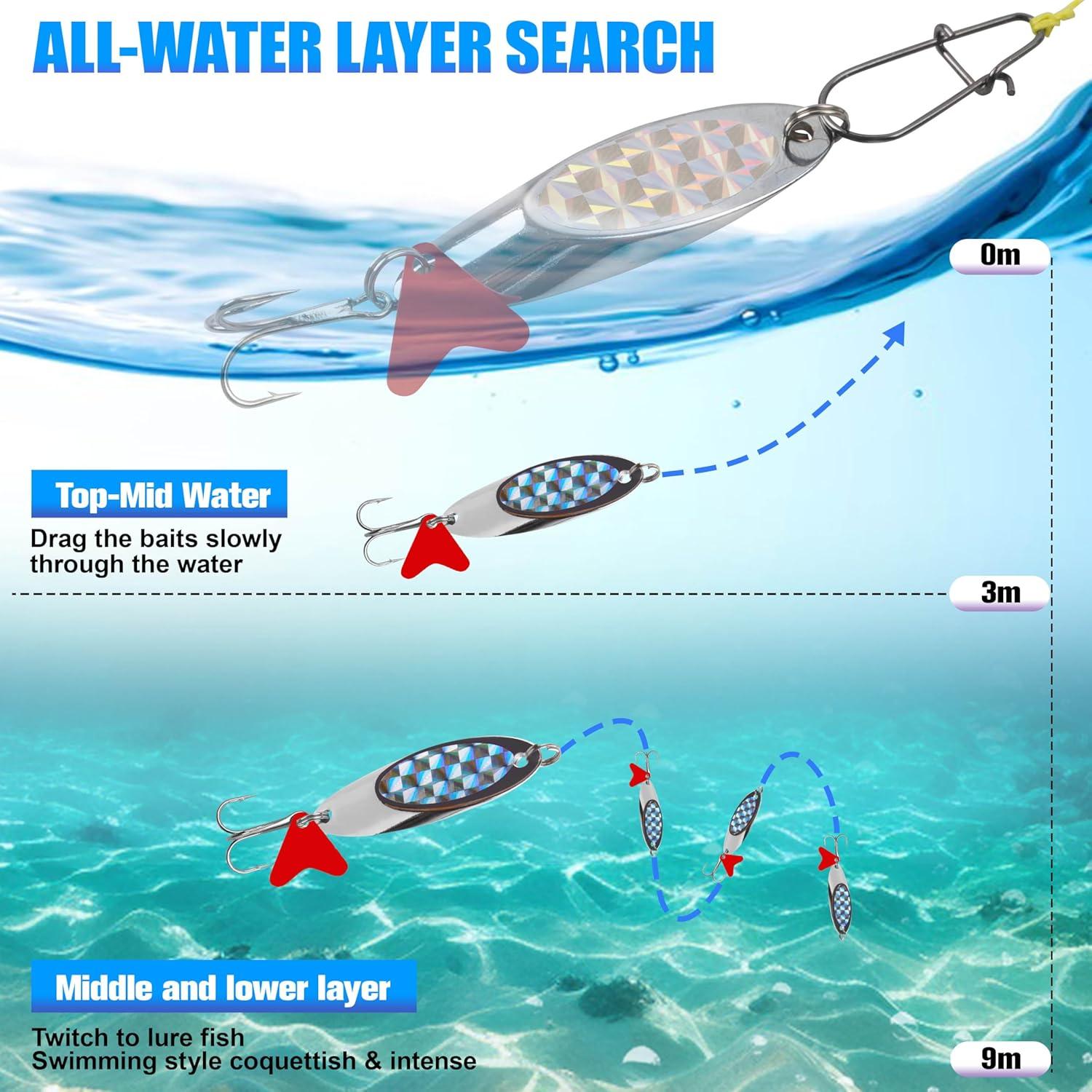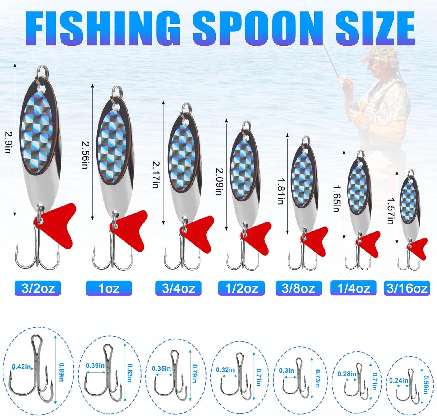 【WIDE APPLICATION】The fishing spoon lure is deal for freshwater and saltwater fishing. Great for catching bass, bluefish, walleye, Pike, devils, Catfish, cobia, stripers, snook and so on. Available Size: 1oz(28g), 3/4oz(21g), 1/2oz(14g), 1/4oz(7g), 3/16oz(5g).