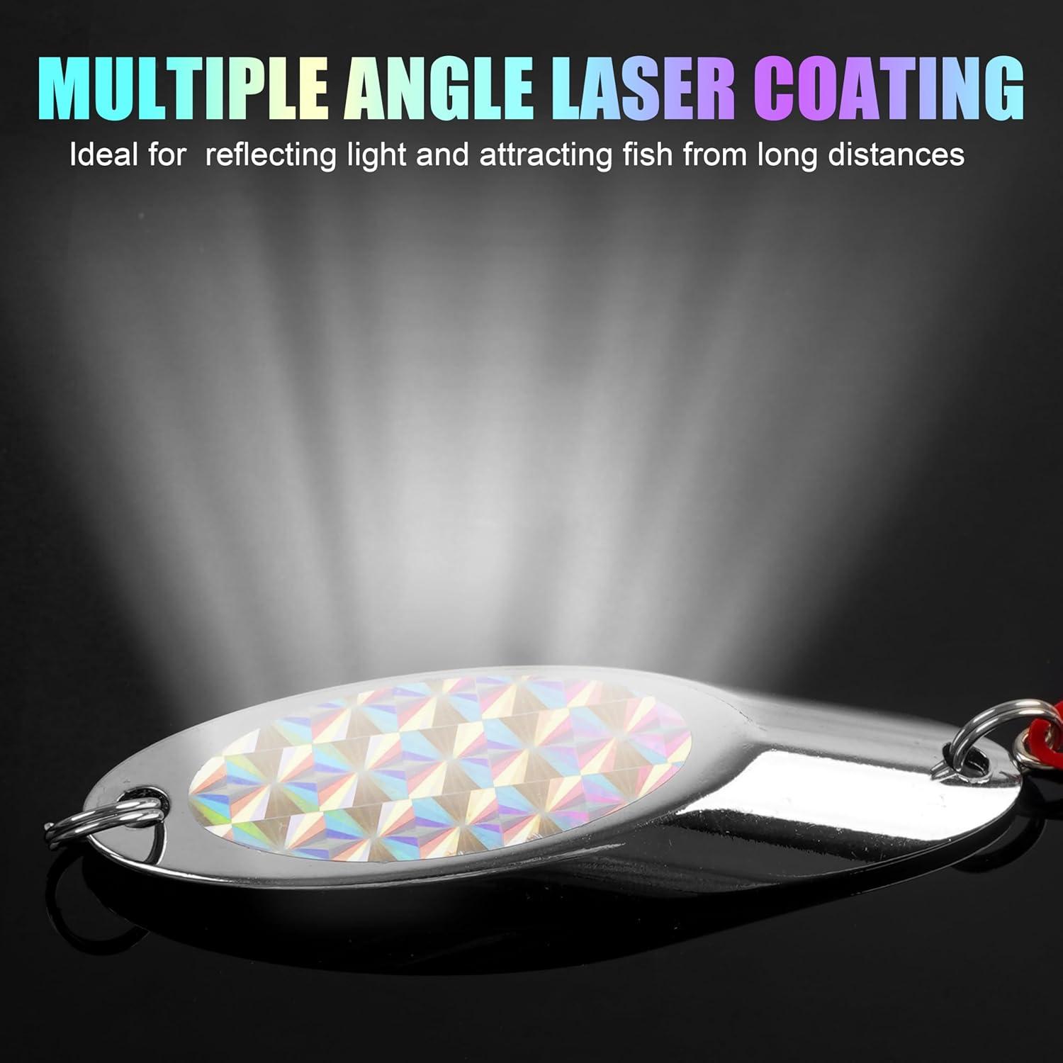 【LIGHT-REFLECTION】The fishing spoon lure has a oblique cutting design and holographic finish has highly reflect. Dragging in the water will have a very dazzling flash effect, easier to be found by fish and to attack.