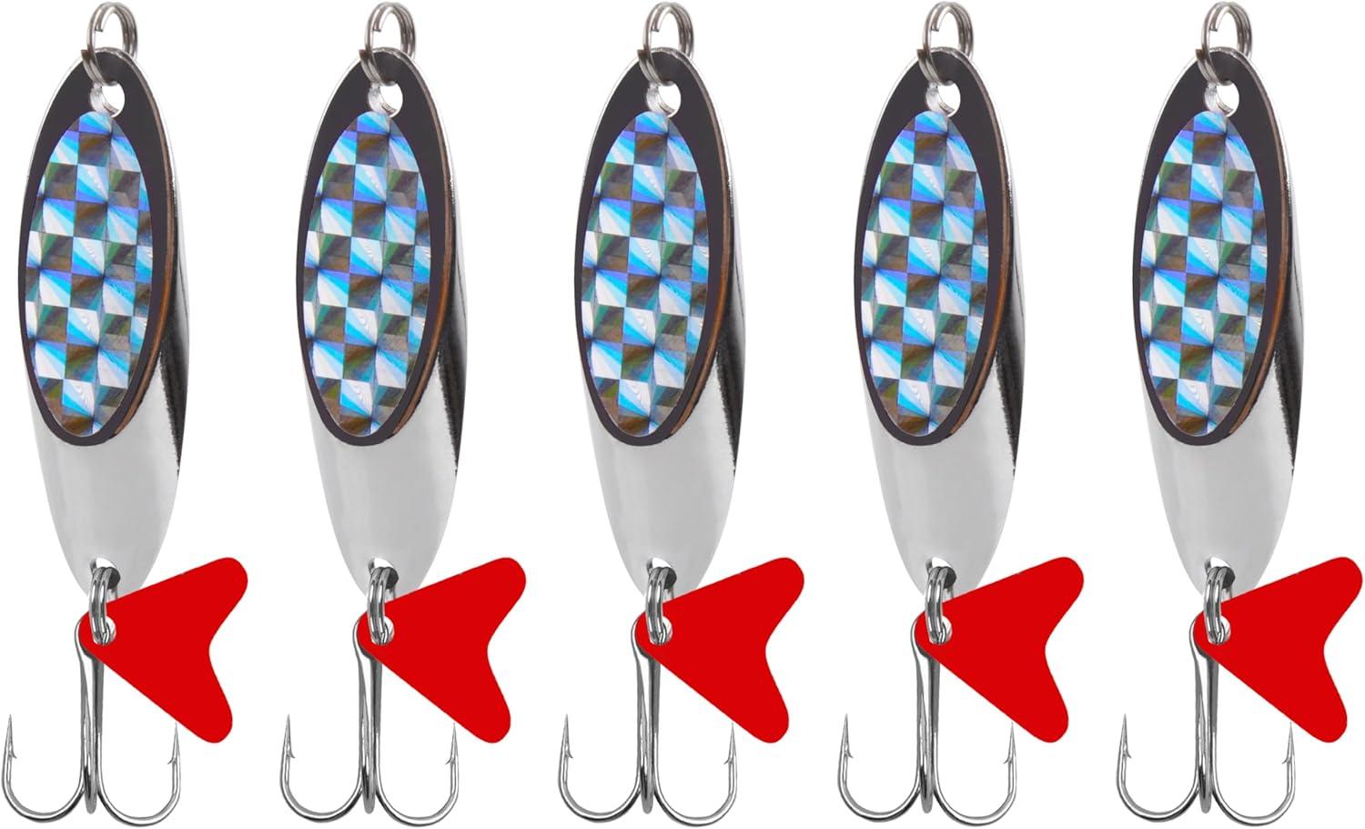 OROOTL Fishing Spoons Lures, 5pcs Metal Spoon Fishing Lures with Feathered Treble Hooks 3/16oz-1oz Jigging Spoons Bait for Bass Trout Pike Walleye Saltwater Freshwater(3/16oz-5pcs)