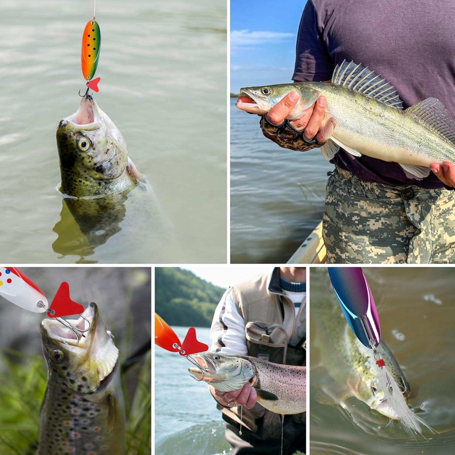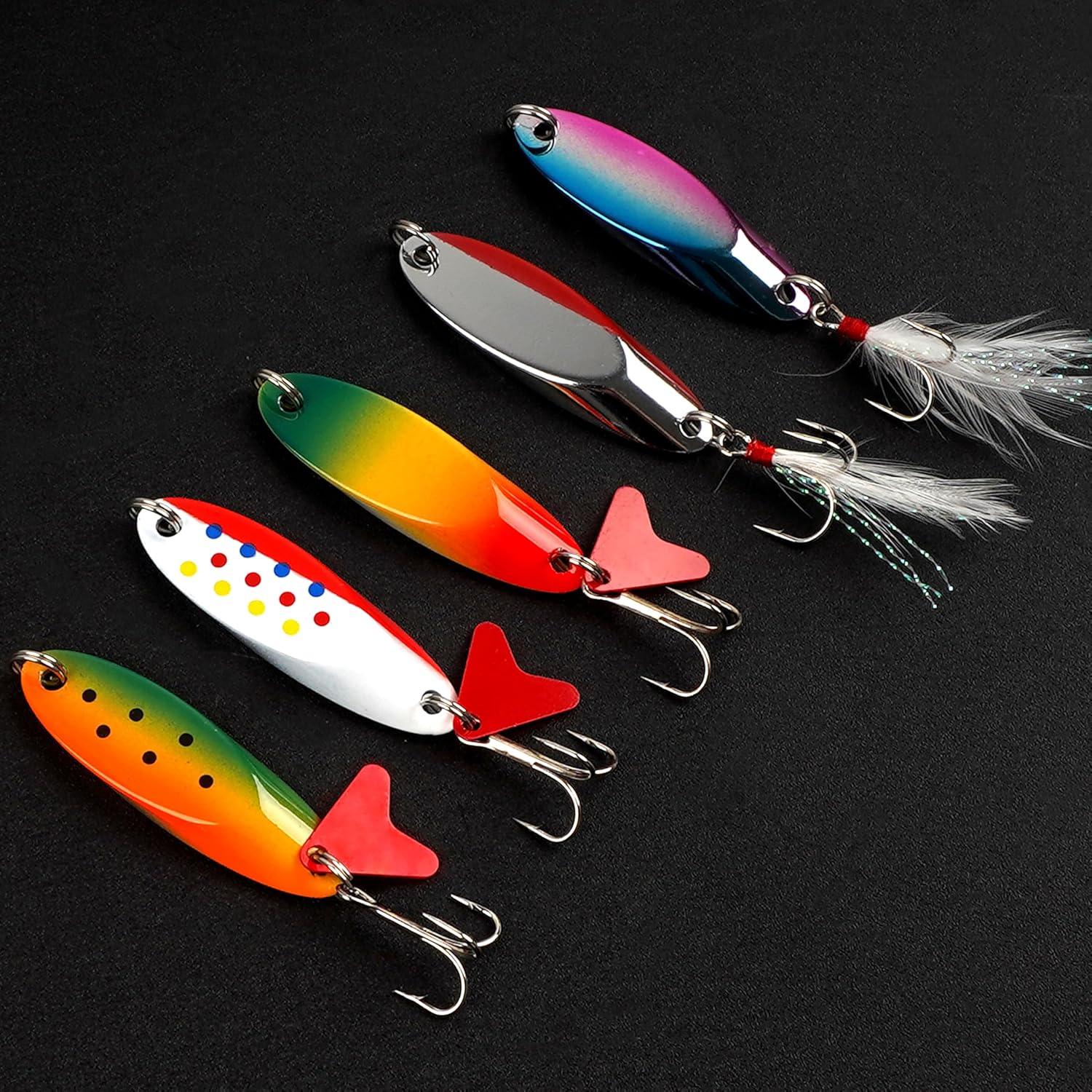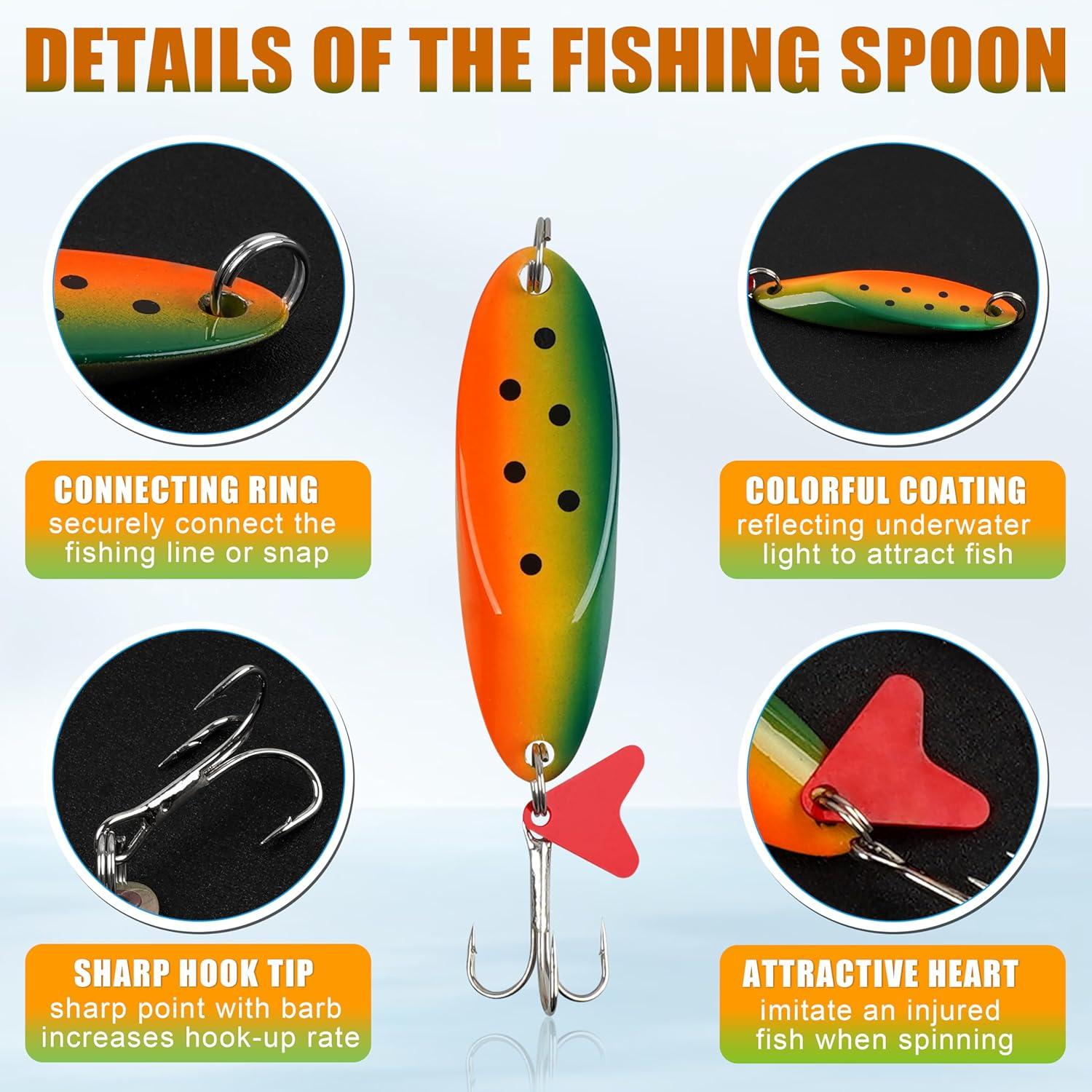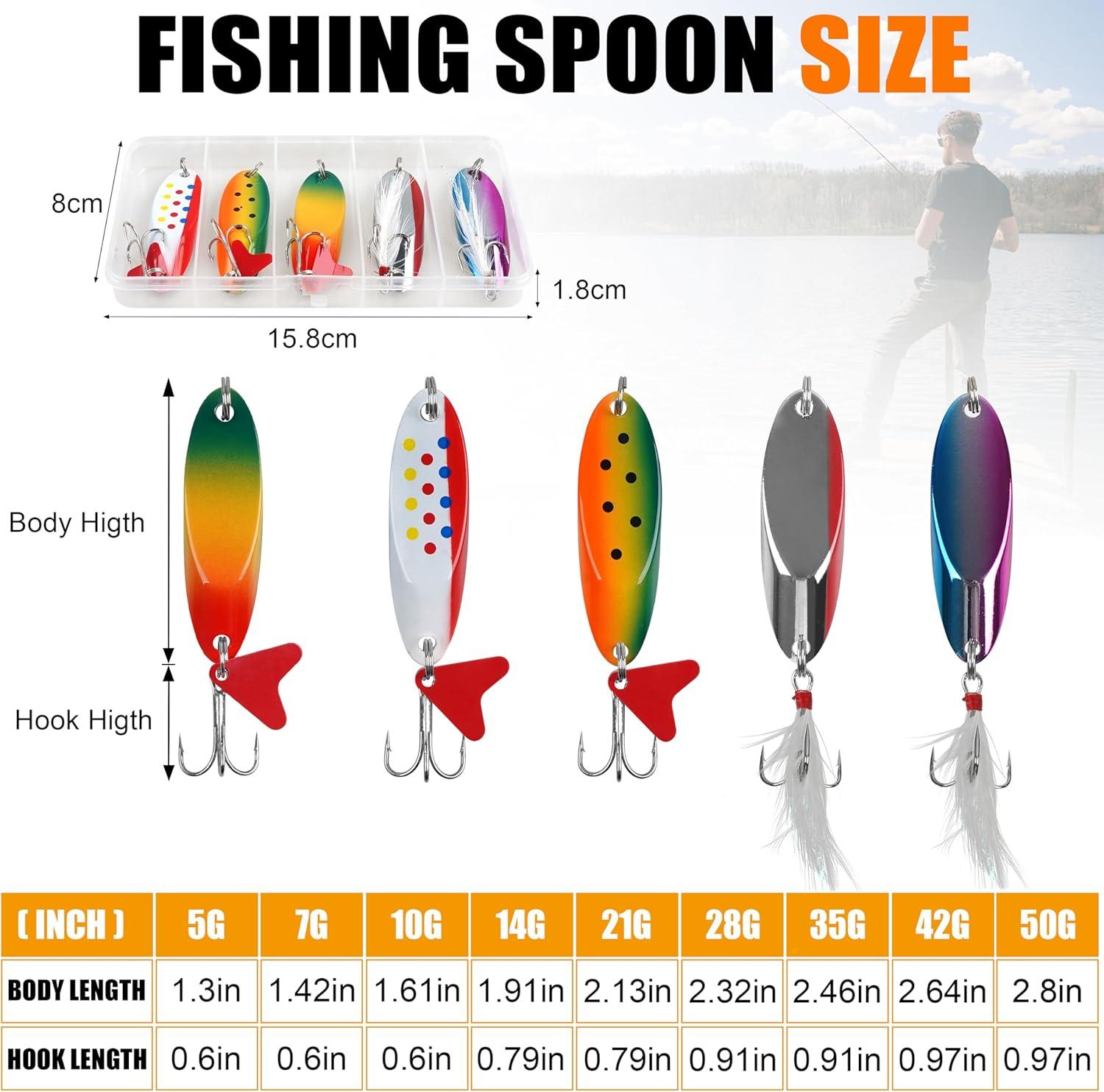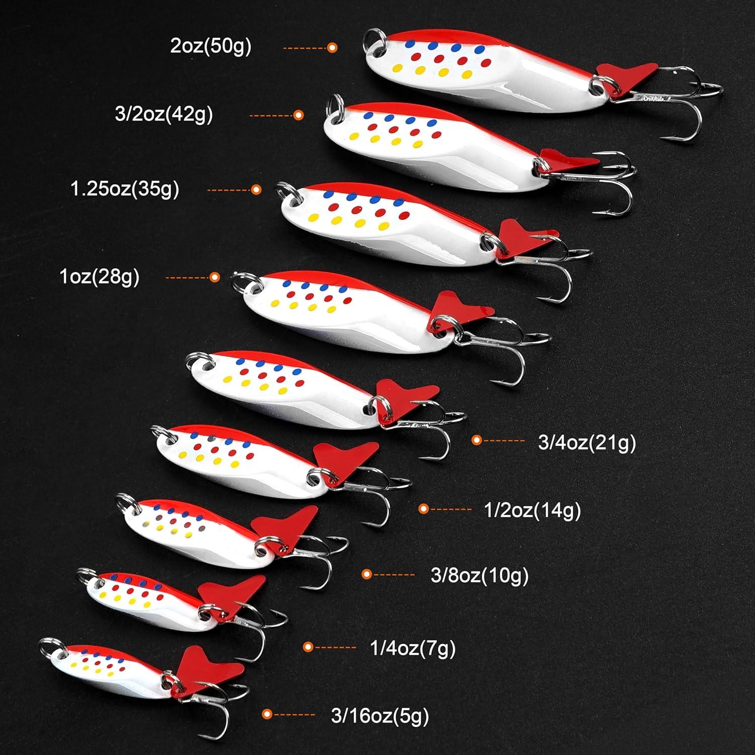 【Versatile Fishing Spoons】 The set includes 5 different colors of jigging spoons, packaged in a plastic box. 9 weights fishing spoons to choose: 3/16oz, 1/4oz, 3/8oz, 1/2oz, 3/4oz, 1oz, 1.25oz, 3/2oz, 2oz. Excellent spoon fishing lures for bass, walleye, salmon, pike, trout, bluegill, panfish, sunfish, striper, musky, and more