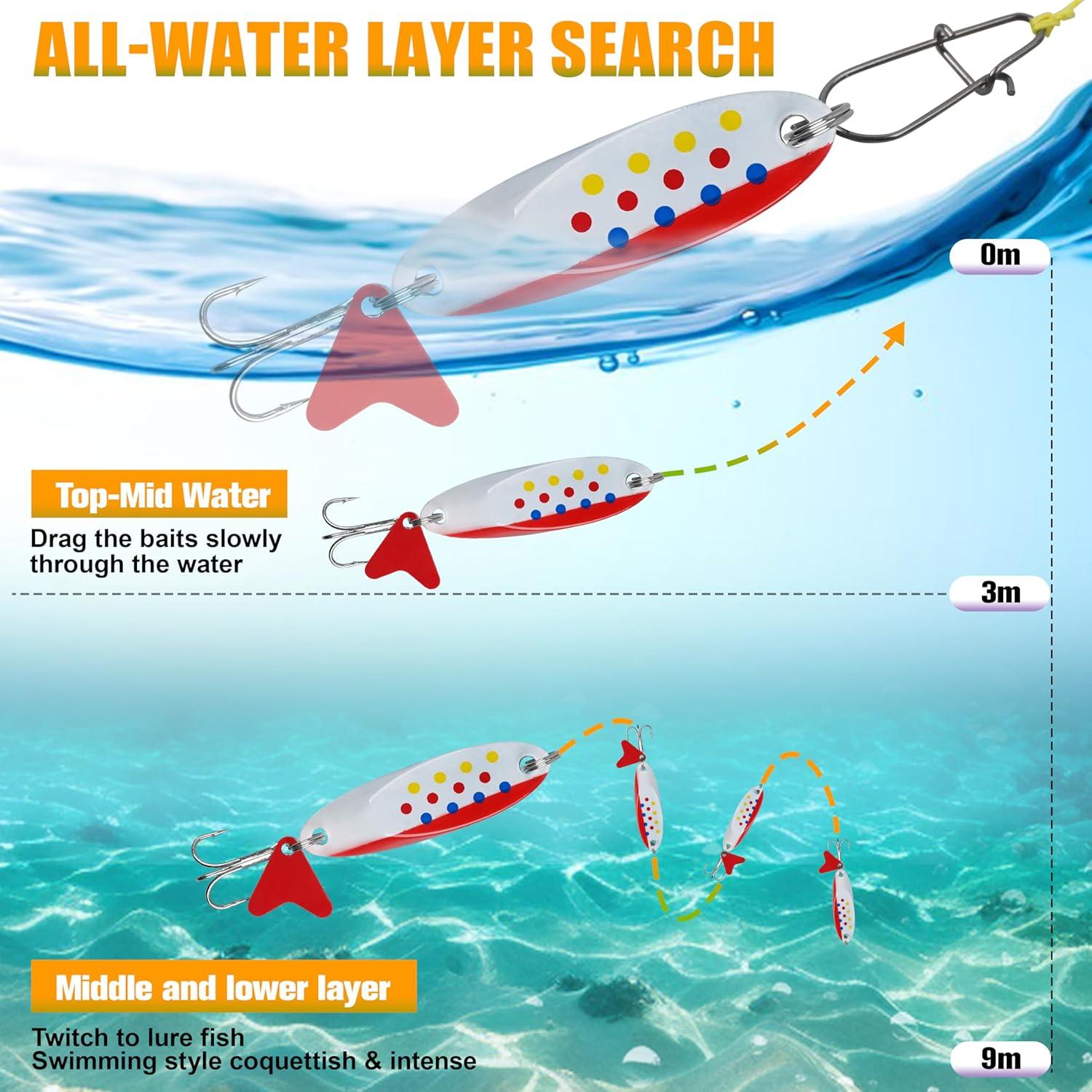 【Attractive Shiny Spoon】 The spoon fishing lure is crafted from premium materials, featuring vibrant, eye-catching colors that resist corrosion and fading for long-lasting durability. The brilliantly polished, mirror-like surface is enhanced with optical brighteners, this fishing spoon delivers unmatched flash and visibility underwater to attract fish