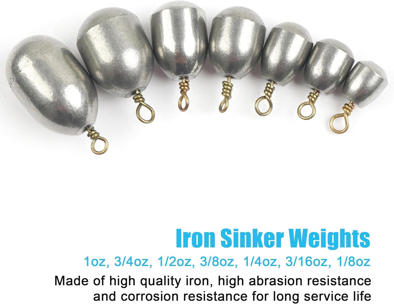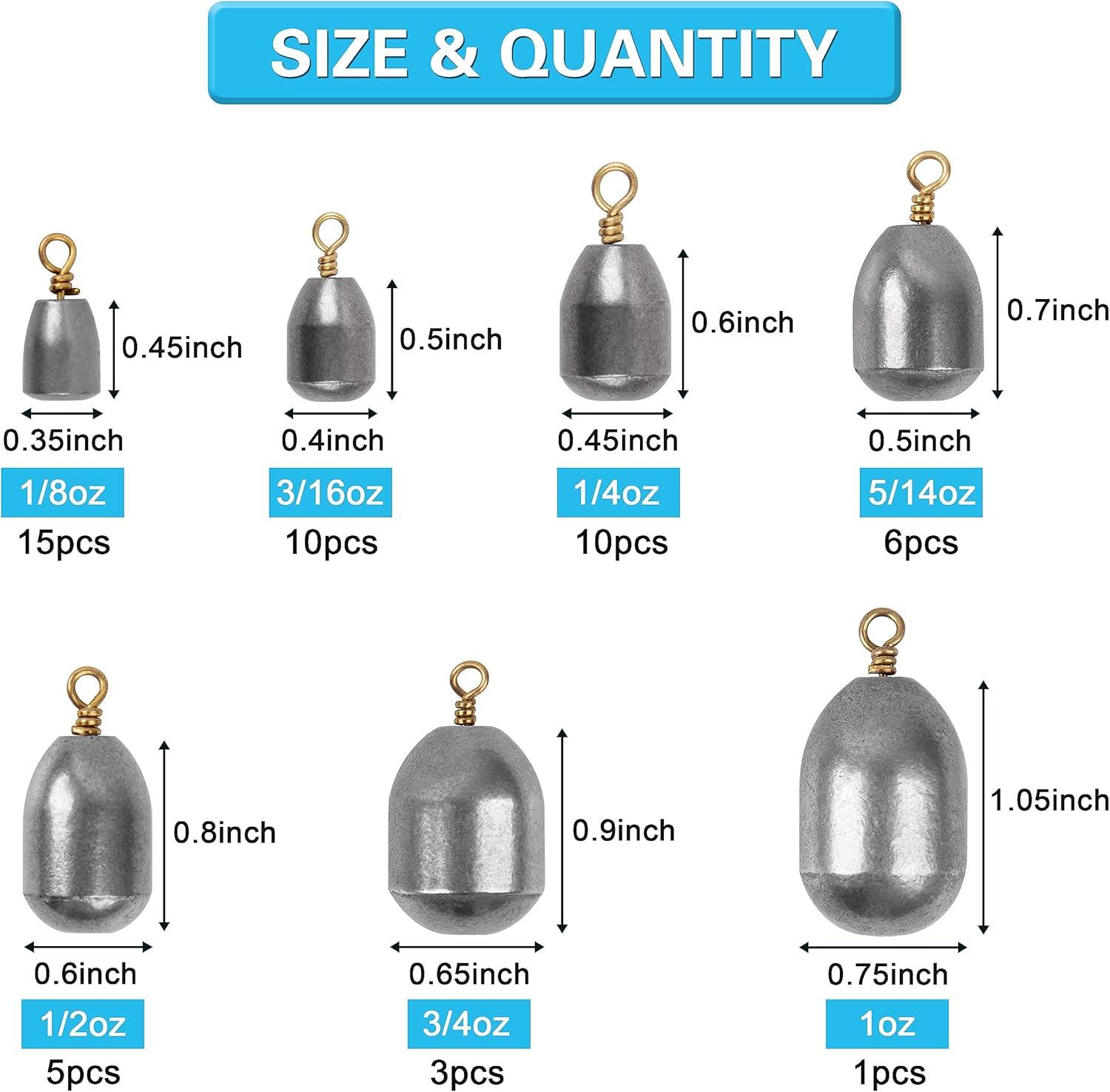 【PACKAGE】50pcs Fishing Sinker Weights Kit. 1oz-1pcs, 3/4oz-3pcs, 1/2oz-5pcs, 3/8oz-6pcs, 1/4oz-10pcs, 3/16oz-10pcs, 1/8oz-15pcs. Stored in a plastic tackle box for easy access and carry.