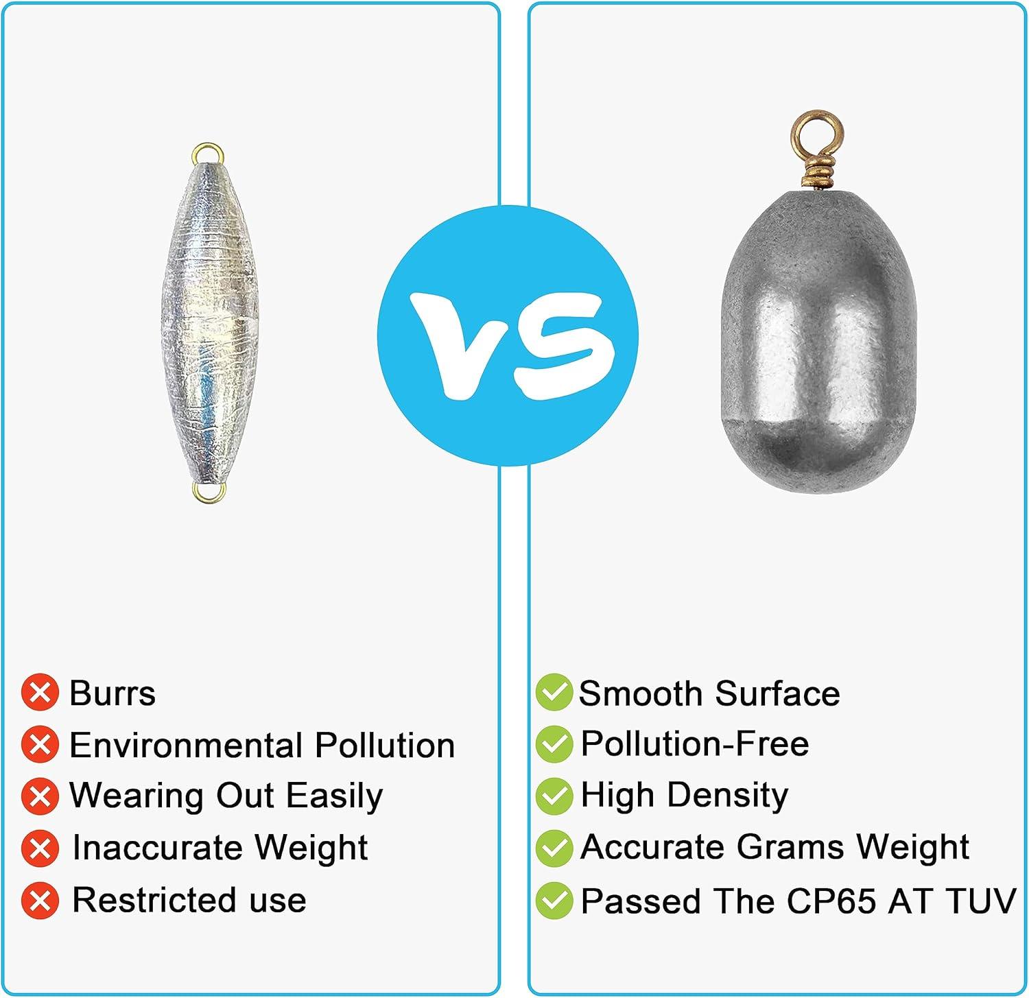 【STREAMLINED DESIGN】The water drop shaped of fishing sinkers helps to reduce splashes in sinking to water and won’t drive fishes away, drop to the bottom very quickly and can effectively avoid obstacles.