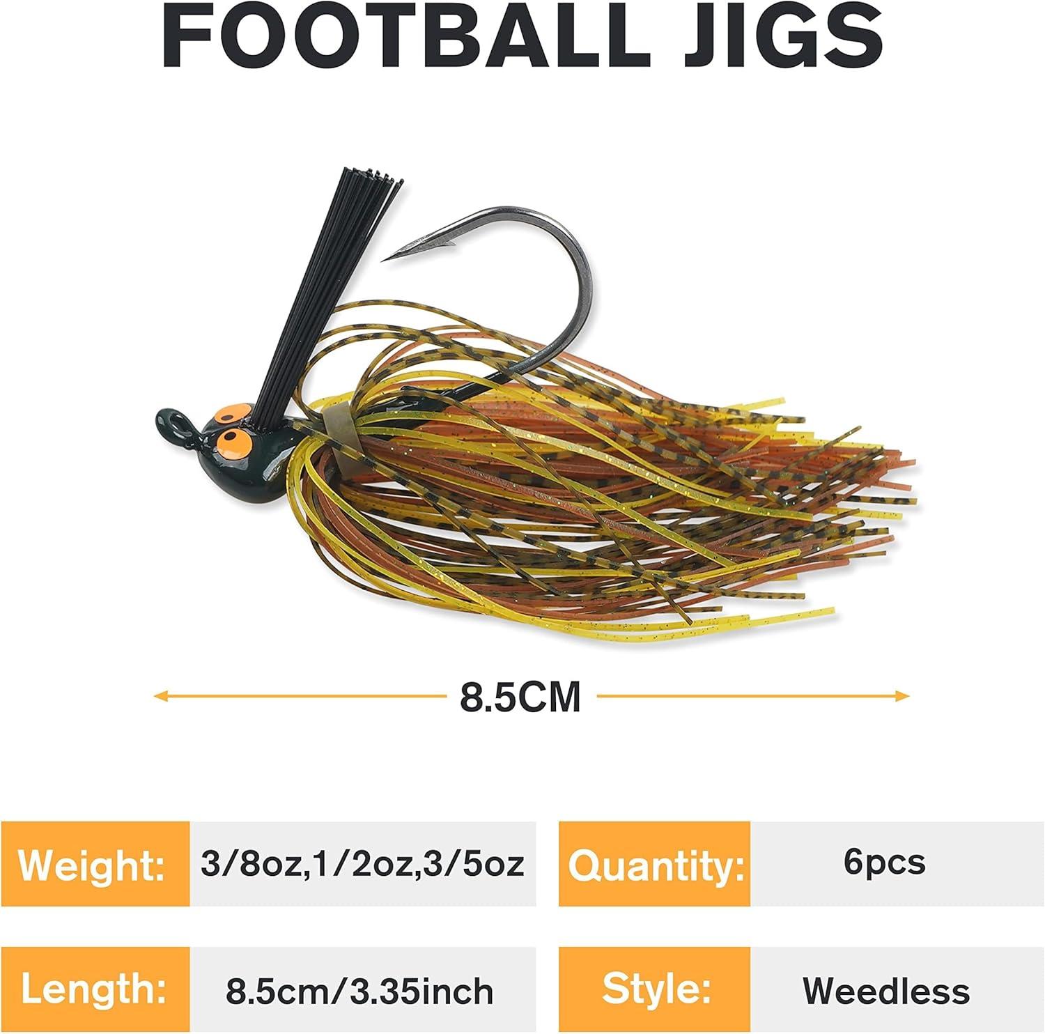 QUANTITY: 6pcs Weedless Football Jigs Fishing Lures Kit. (Weight: 3/8oz-2pcs, 1/2oz-2pcs, 3/5oz-2pcs)