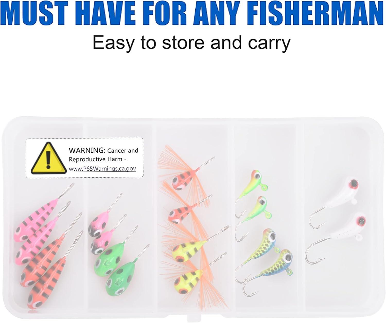 ๐ŸŸ PORTABLE: Ice fishing jigs with organized storage box, keep the small jigs organized. Easy take in and easy take out with the jigs. Holds jigs securely in the box, which can protect the ice fishing jigs from collision and wear.