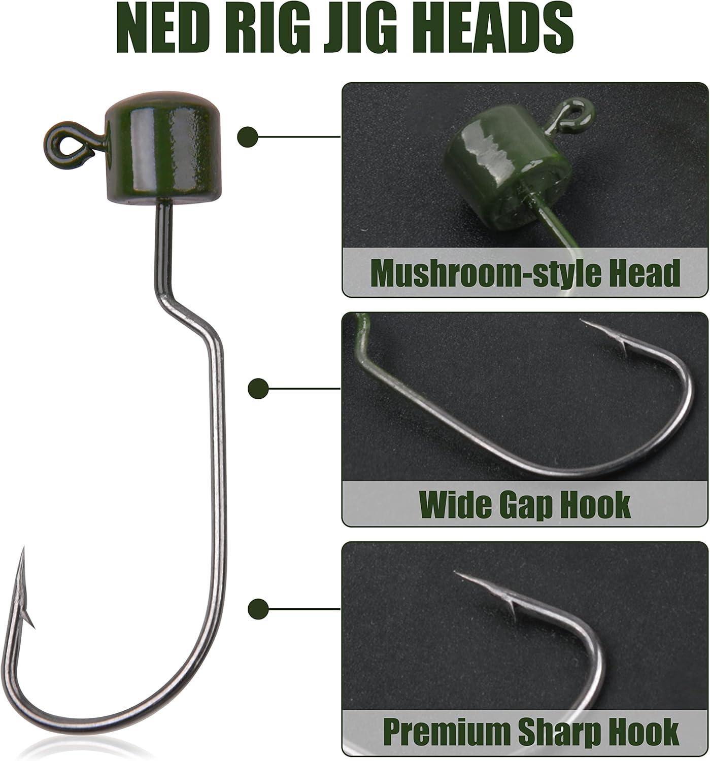 🐟【POPULAR COLORS】The Ned Rig Jig Heads Kit includes the 5 most popular colors of Ned Rig jig heads to match almost any fishing application, Black, White, Green Pumpkin, Chartreuse and Red.