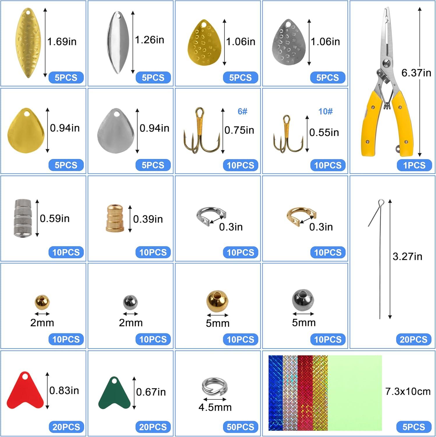 【246PCS SPINNER DIY KIT】Including 1pcs fishing pliers, 30pcs spinner blades, 20pcs treble hooks, 20pcs wire shaft, 20pcs clevises, 20pcs lure bodies, 40pcs beads, 50pcs split rings, 5pcs holographic adhesive film, 40pcs plastic heart sheets. You can enjoy the fun of making spinner bait by hand at home!
