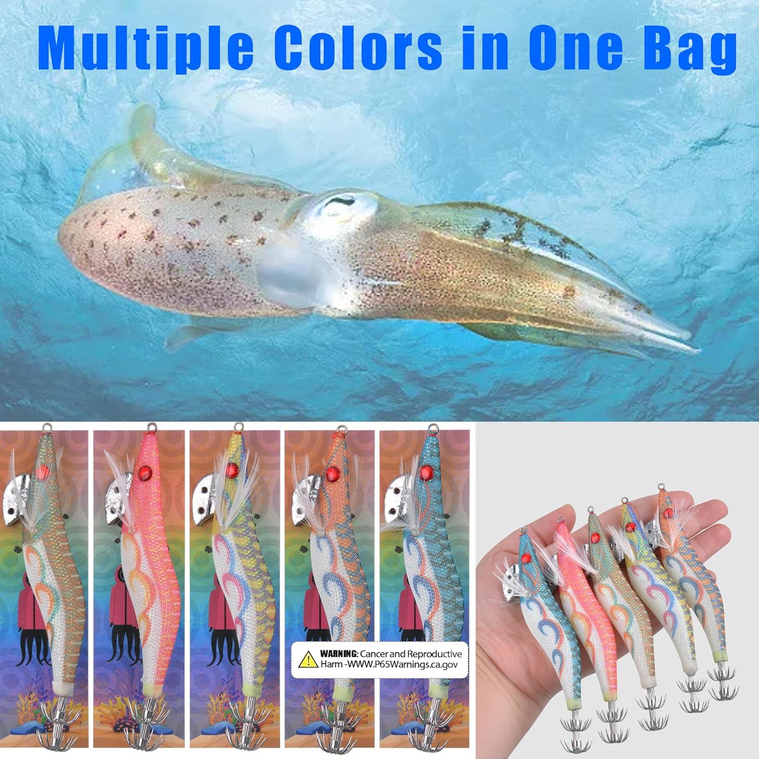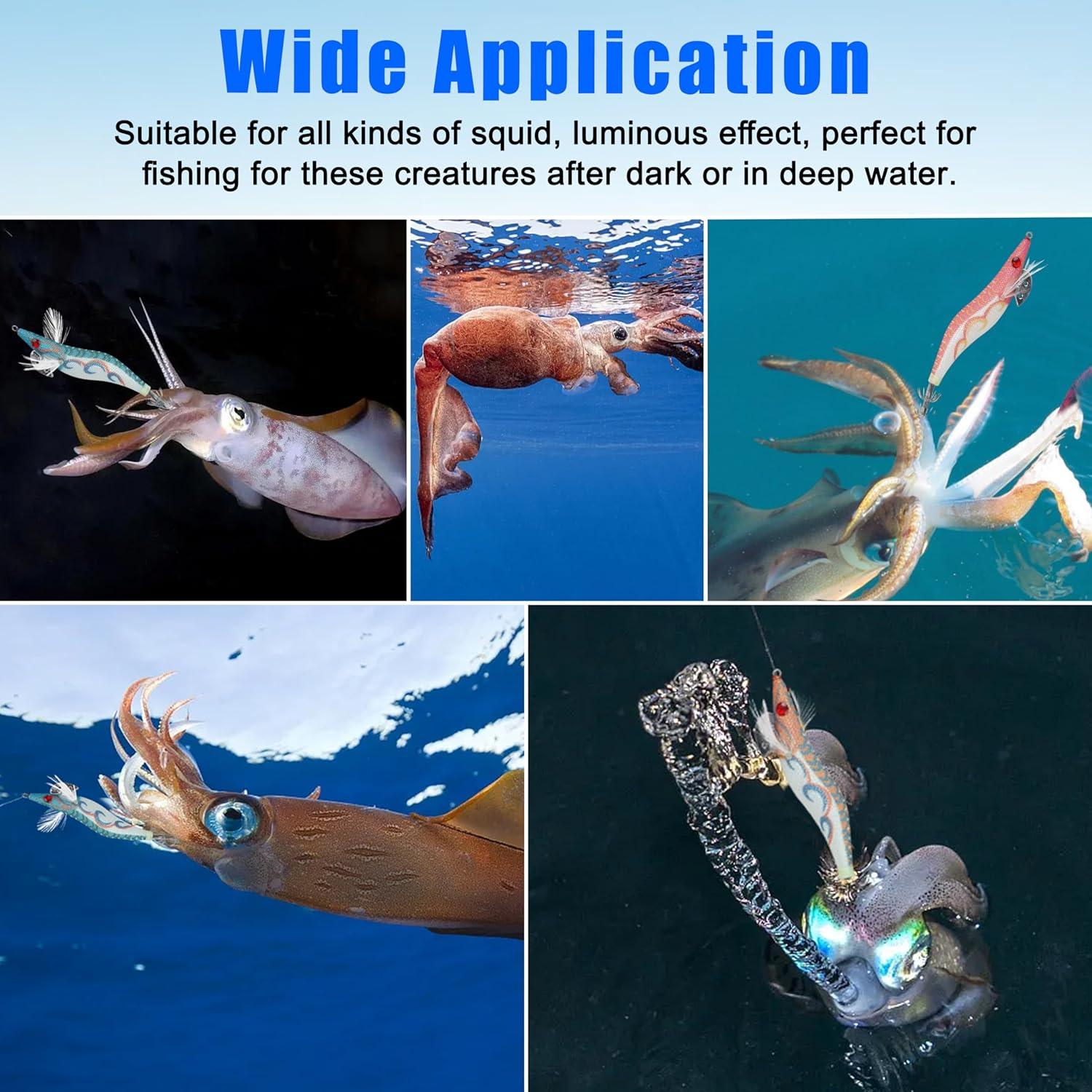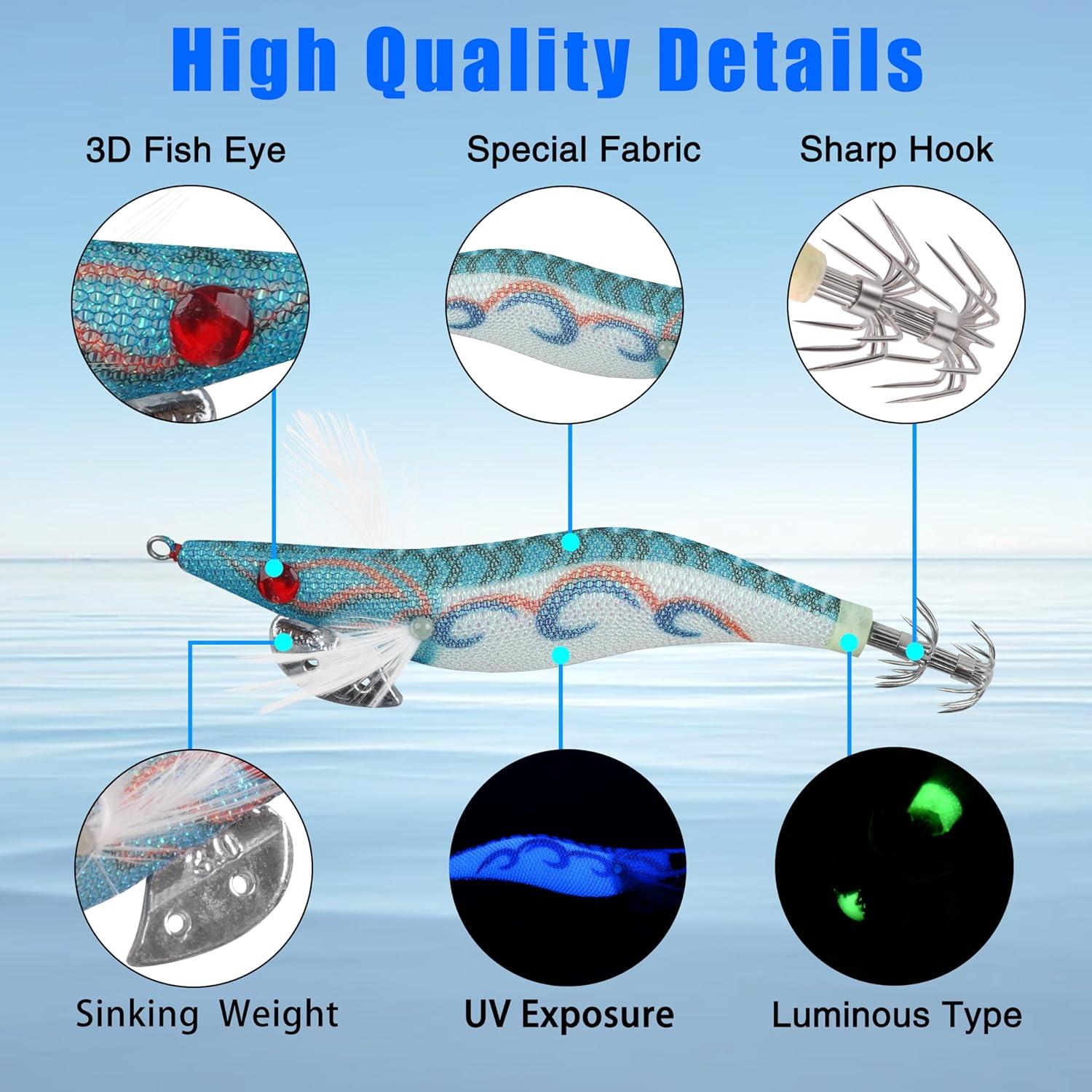 🐟【Dual-Layer Hook】The squid jig lures have super strong dual-layer split hooks, super sharp and durable, and the body surface is covered with a special fabric that increases the friction between the predator and the squid jig, effectively prevents squids form escaping.