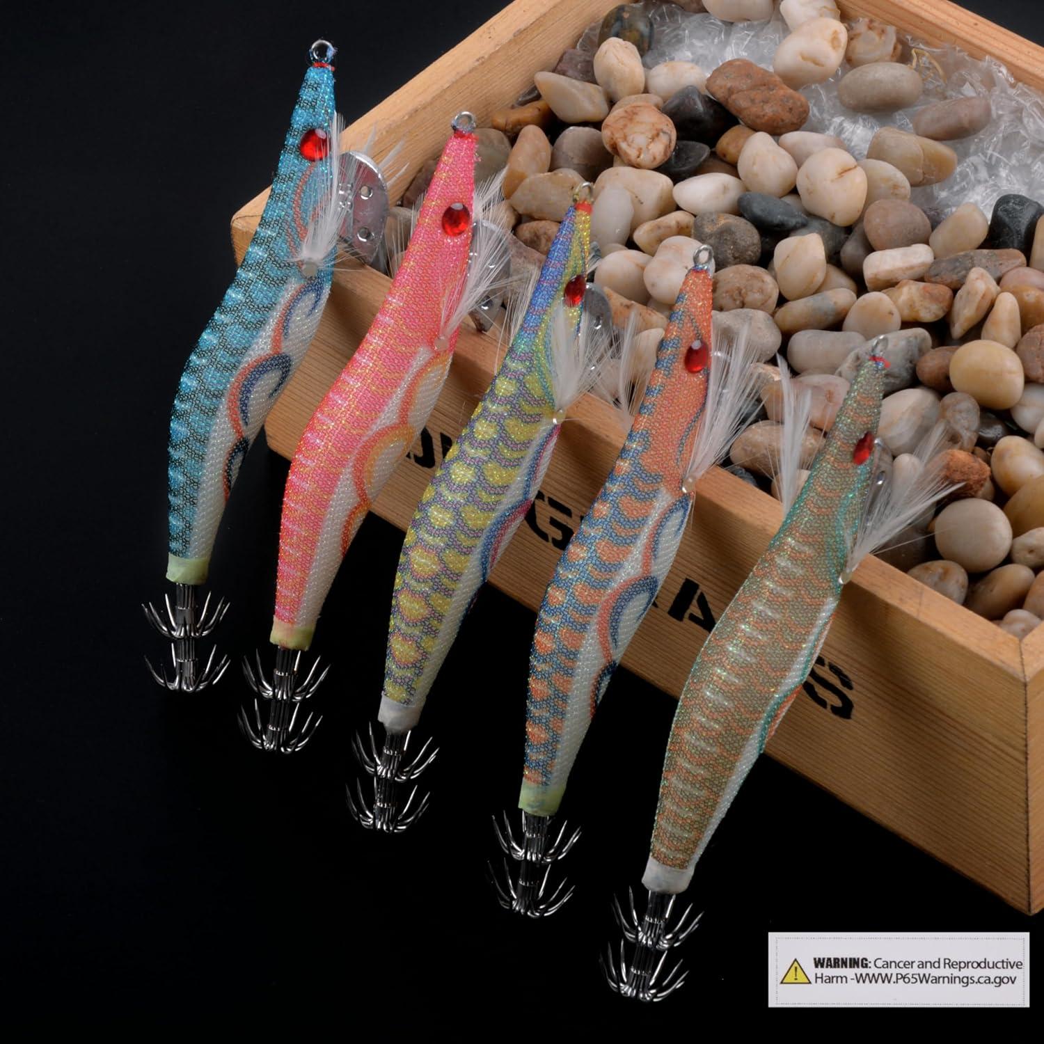 OROOTL Squid Jig Saltwater Fishing Lures, 5pcs Saltwater Glow Squid Jig Hooks Hard Bait Luminous UV Shrimp Prawn Lures Fluorescent Cuttlefish Sleeve Squid Jigs Kit for Cuttlefish Octopus Fishing(2.5#-5pcs)