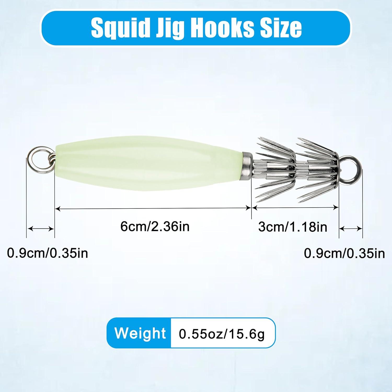 【LONGER LUMINOUS TIME】Especifical luminous lure body for squid fishing have high visibility. After absorbing light, the squid jig lures can glow in the dark to attract squid. The glow time of our squid jigs saltwater is longer than others