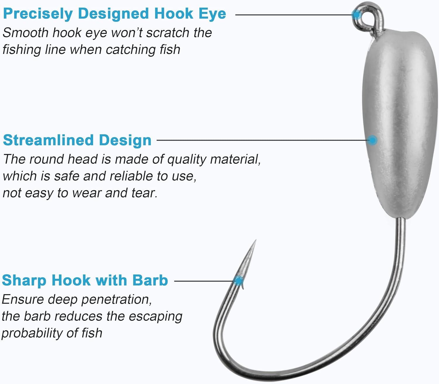 🐟【Quantity & Size】12pcs/box fishing tube jig heads. Available Sizes: 1/8oz, 1/4oz, 3/8oz. This fishing jig head hook will be useful for your various fishing needs.