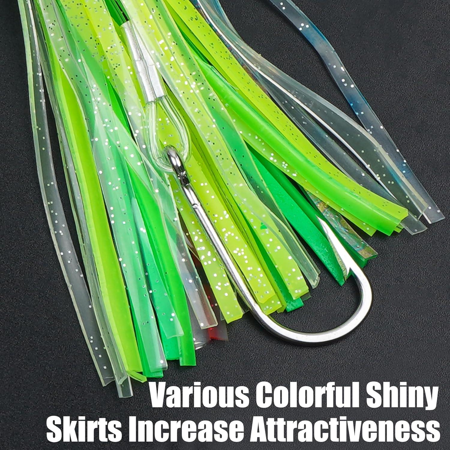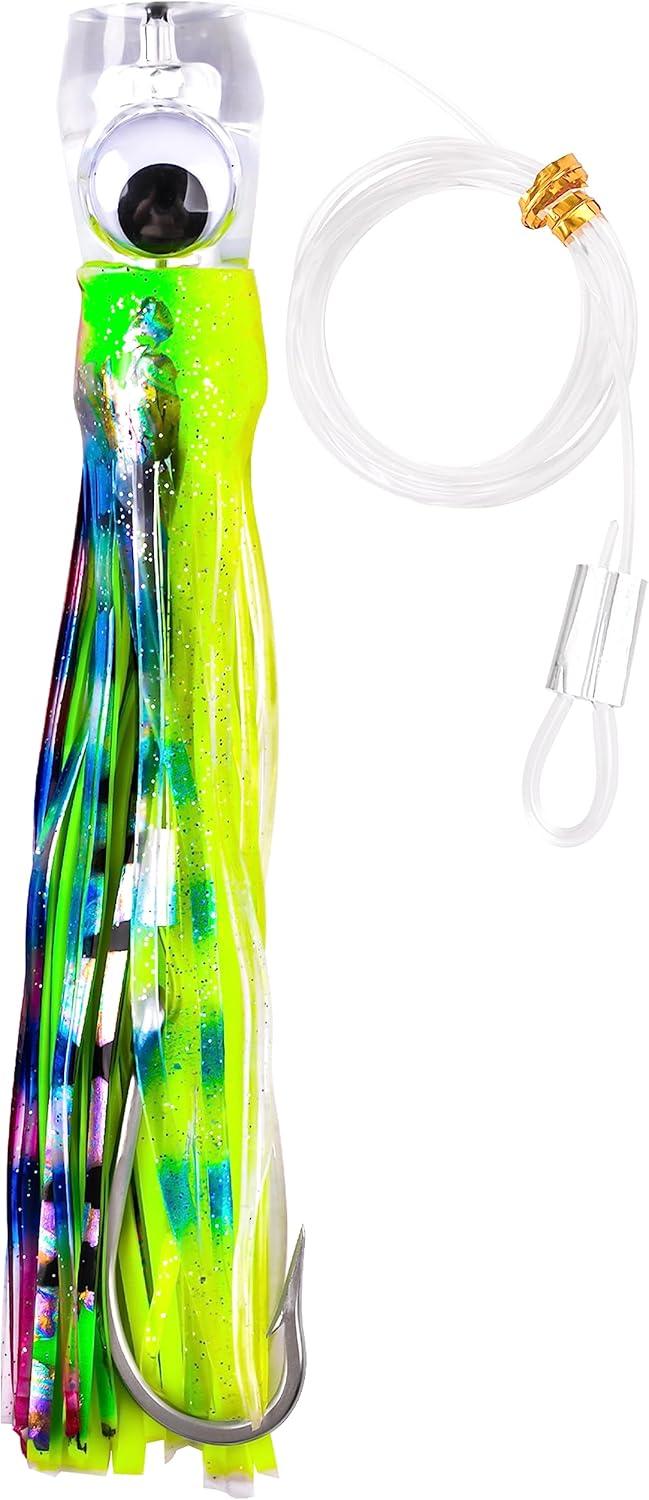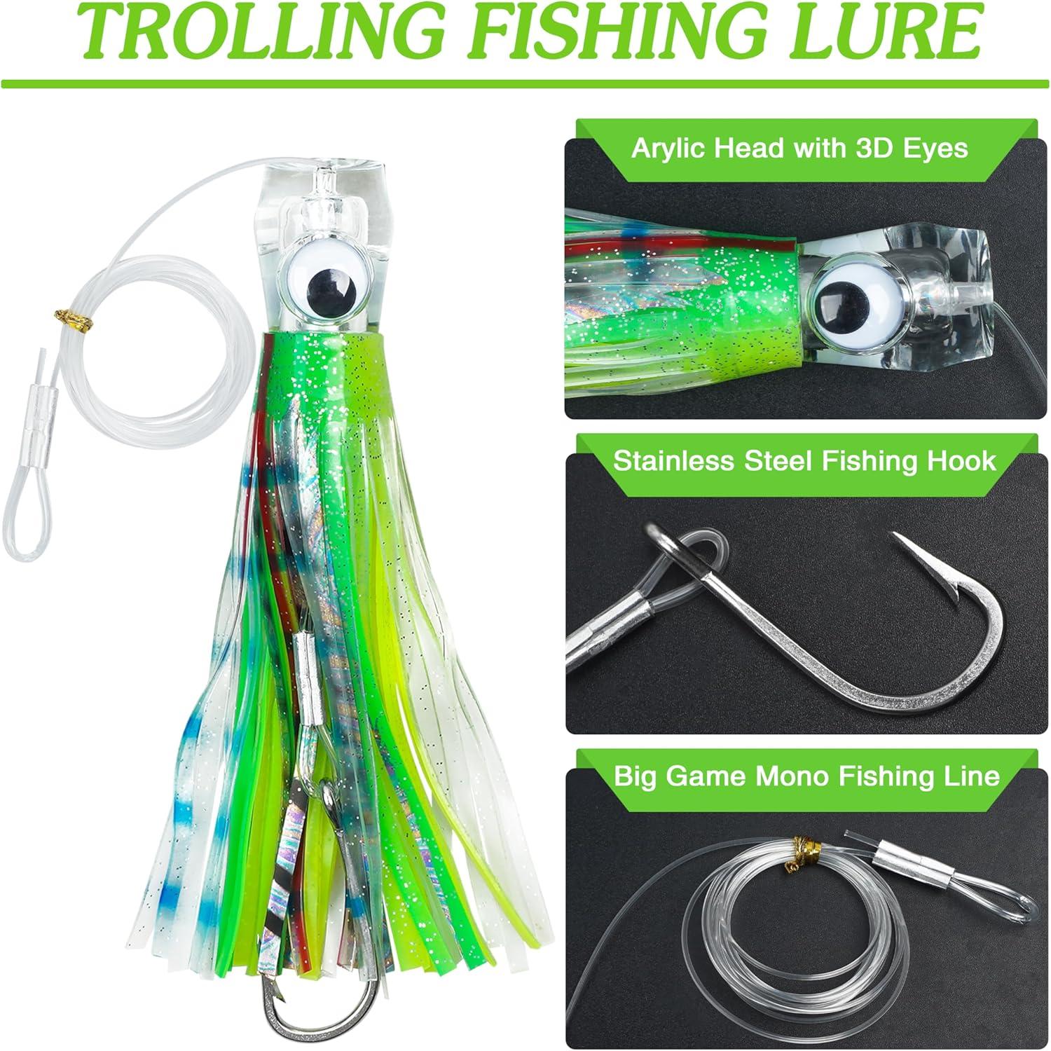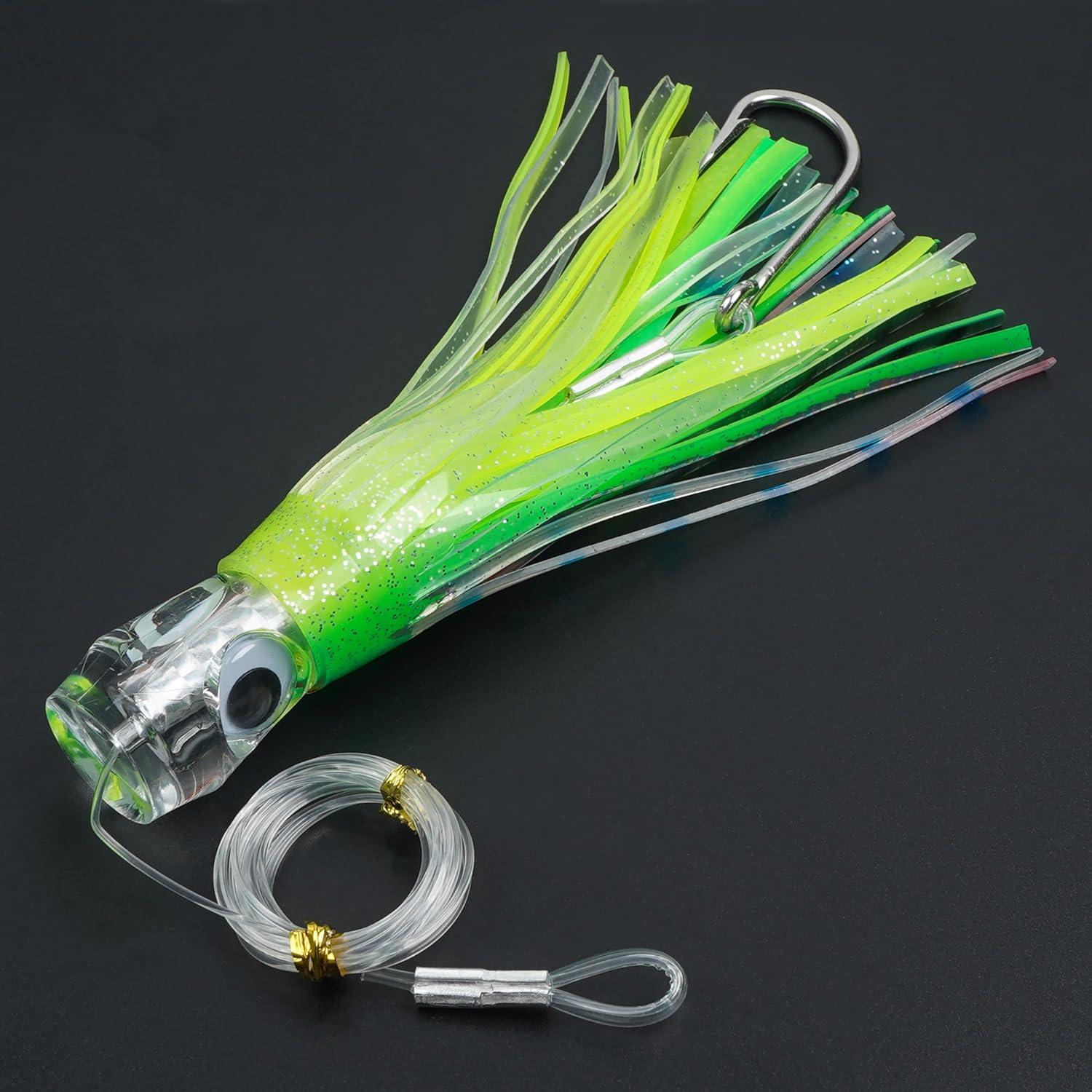 Saltwater Fishing Lures 6/9inch Trolling Lures for Marlin Mahi Tuna Dolphin Shark Big Game Deep Sea Fishing Baits Squid Skirts Rigged Hooks Ocean Gear Tackle(Green-1pcs)