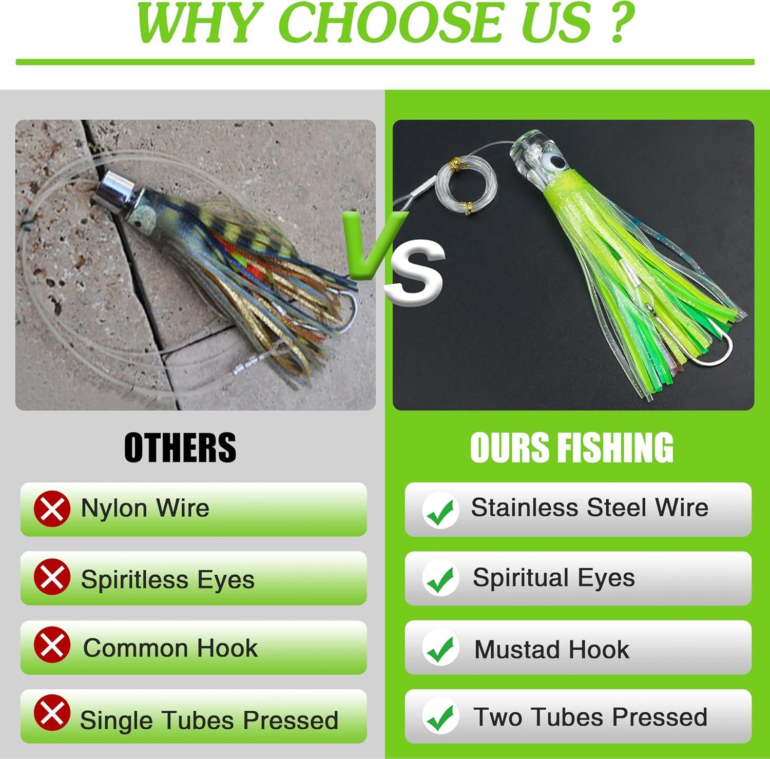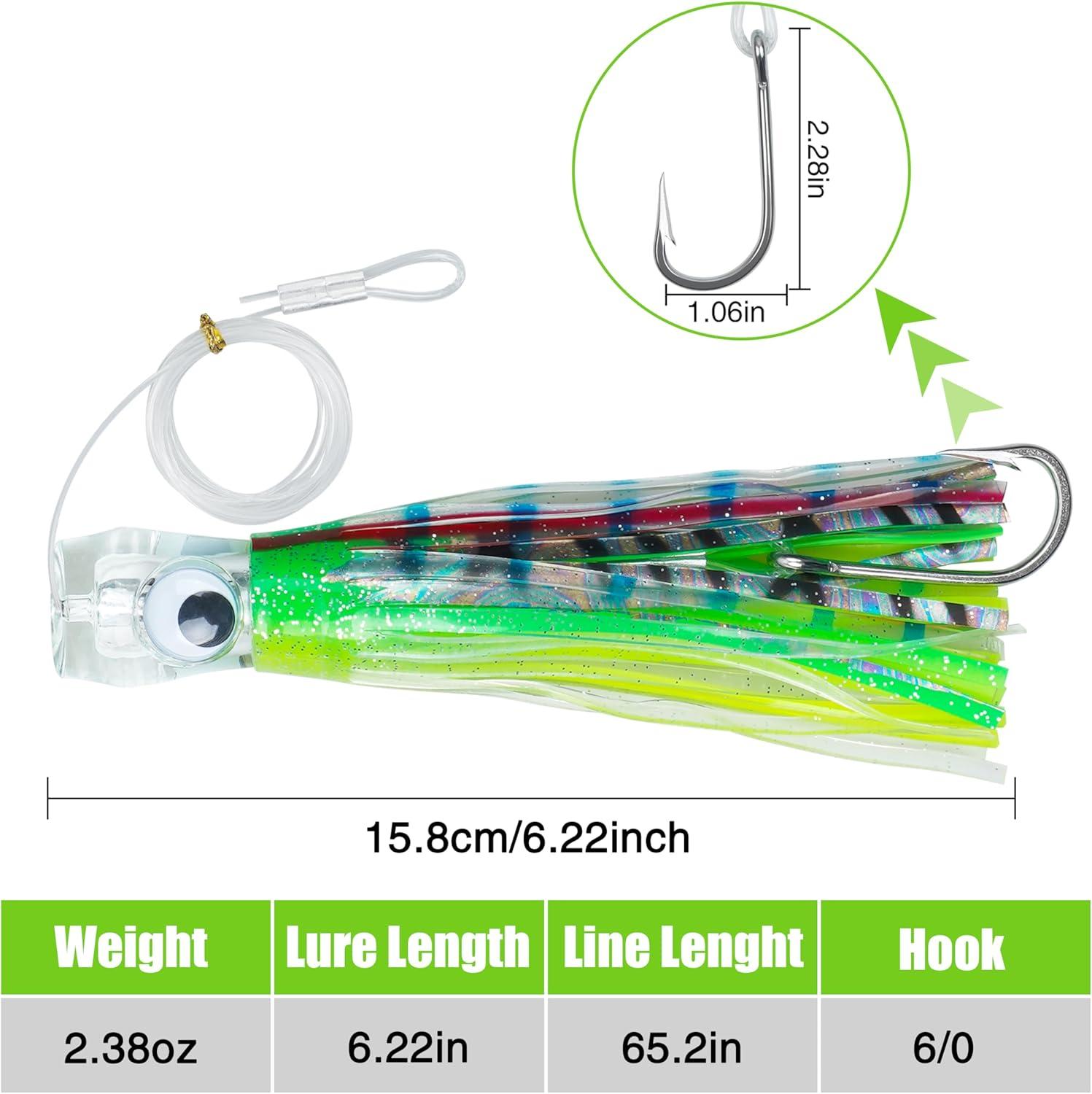 【Specification】6inch saltwater fishing trolling lures, pre-rigged with 6/0 stainless steel hook and mono leader line (about 60inch, test 150lb). Weight: 2.38oz/pcs, Quantity: 1pcs/5pcs.
