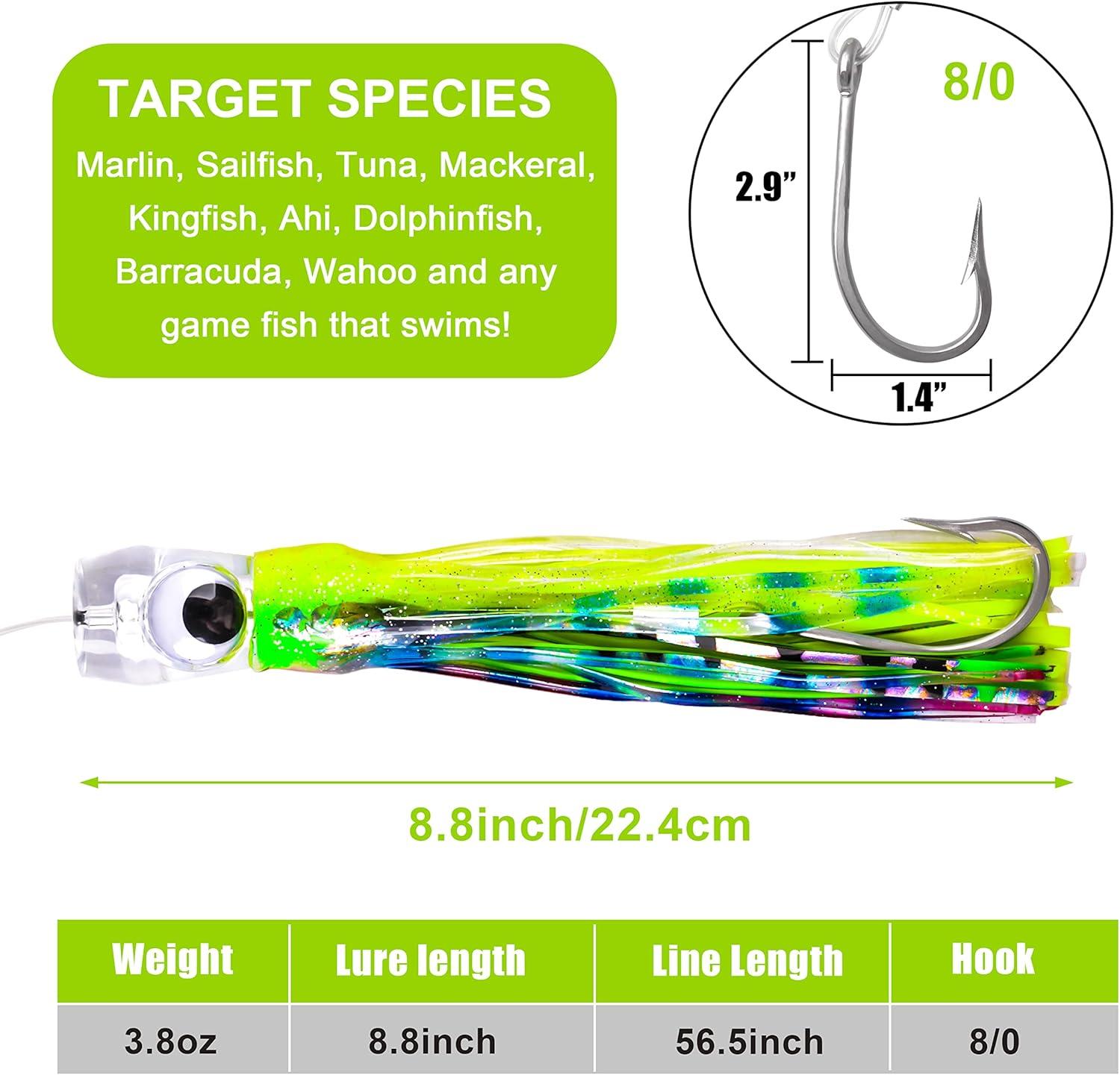 【TARGET SPECIES】Saltwater Fishing Trolling Lures for Marlin, Sailfish, Tuna, Mackeral, Kingfish, Ahi, Dolphinfish, Barracuda, Wahoo and any game fish that swims! Please handle with special care for there are several sharp hooks and corners. Please keep out of reach of children.