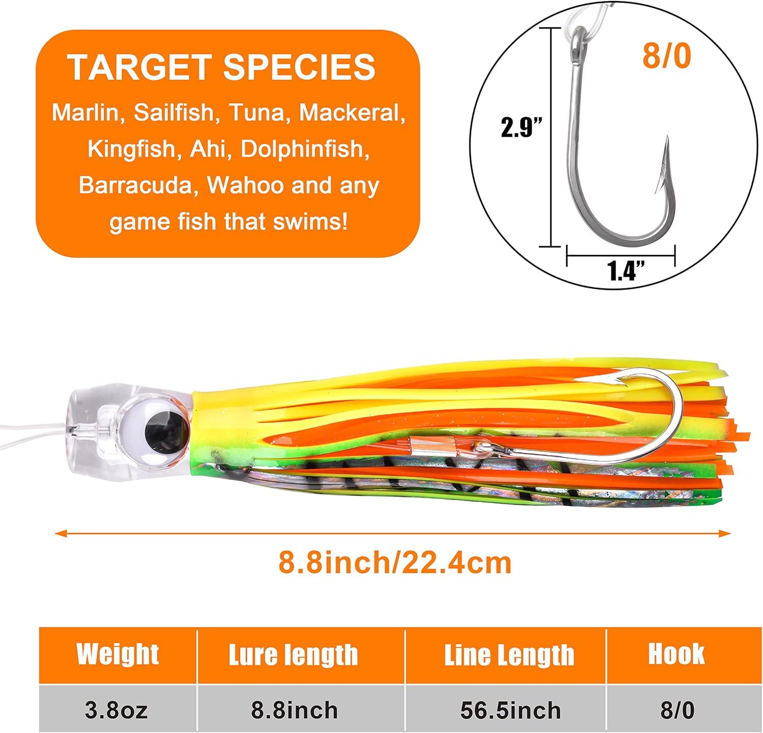 【TARGET SPECIES】Saltwater Fishing Trolling Lures for Marlin, Sailfish, Tuna, Mackeral, Kingfish, Ahi, Dolphinfish, Barracuda, Wahoo and any game fish that swims! Please handle with special care for there are several sharp hooks and corners. Please keep out of reach of children.