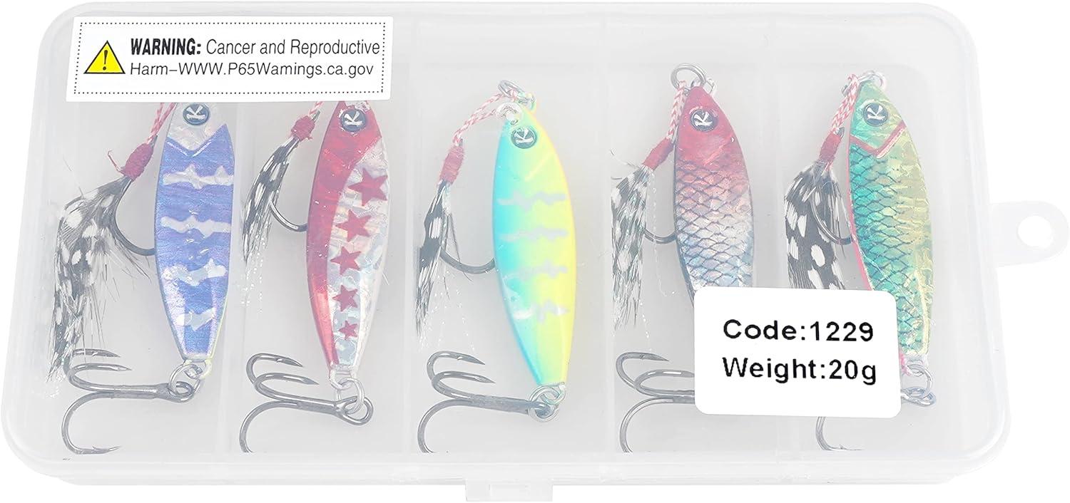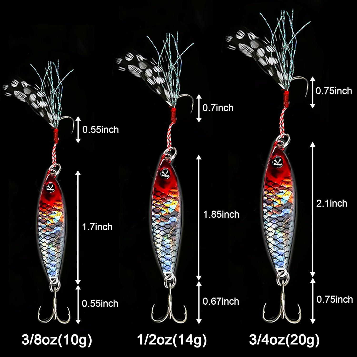 【Quantity & Size】5pcs/box, including 5 colors jigging spoon lures. Size: 3/8oz(10g); 1/2oz(14g); 3/4oz(20g). Different weight to meet different throwing needs and diving depth. Offshore Jigs fit for all swim layers in freshwater and Saltwater.