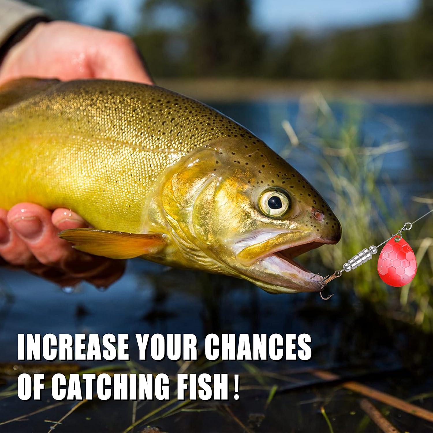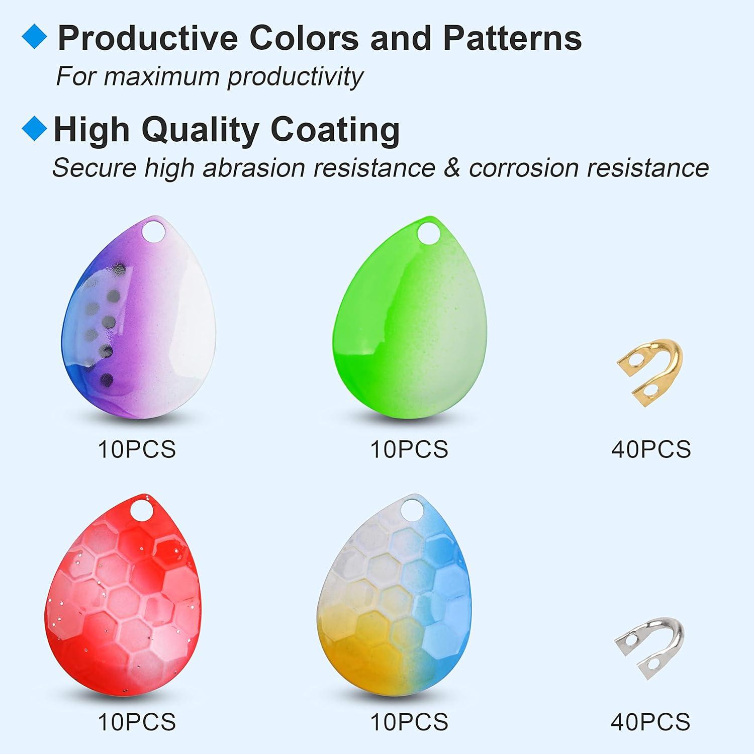 【QUANTITY】100pcs spinning bait kit includes 40pcs spinner blades and 60pcs U shaped spinner Clevis. The colorado blades have 4 colors (0.85″*1.1″), and the proven patterns and bright colors attract big fishes.