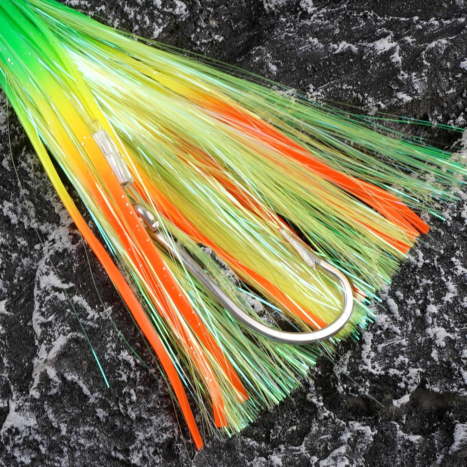 【Fully Rigged】9inch Rigged Offshore Trolling Lures Rigged with 150lb mono leader(59inch), 8/0 stainless steel fishing hook, weight about 3oz/pcs. 6 bright colors for your choice.