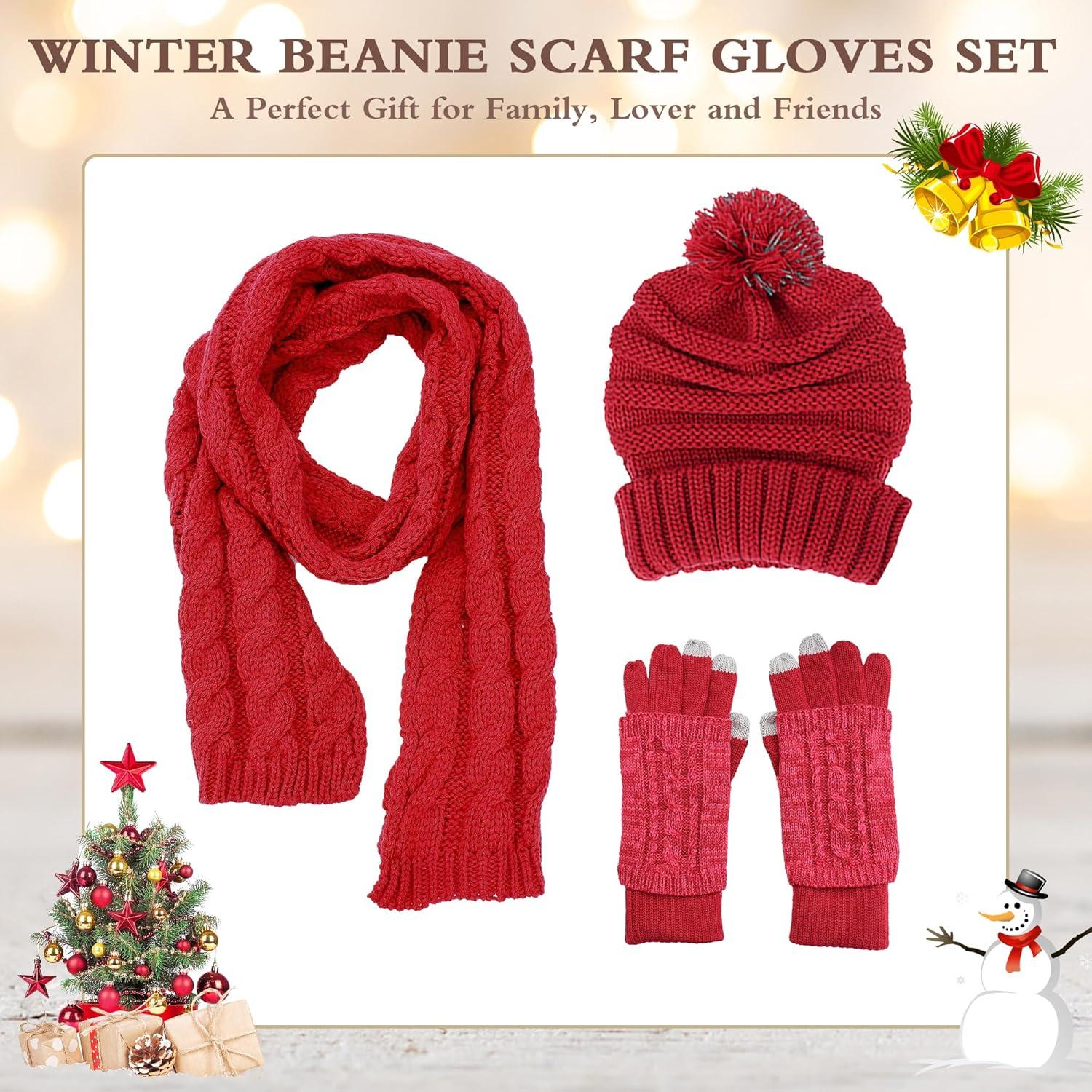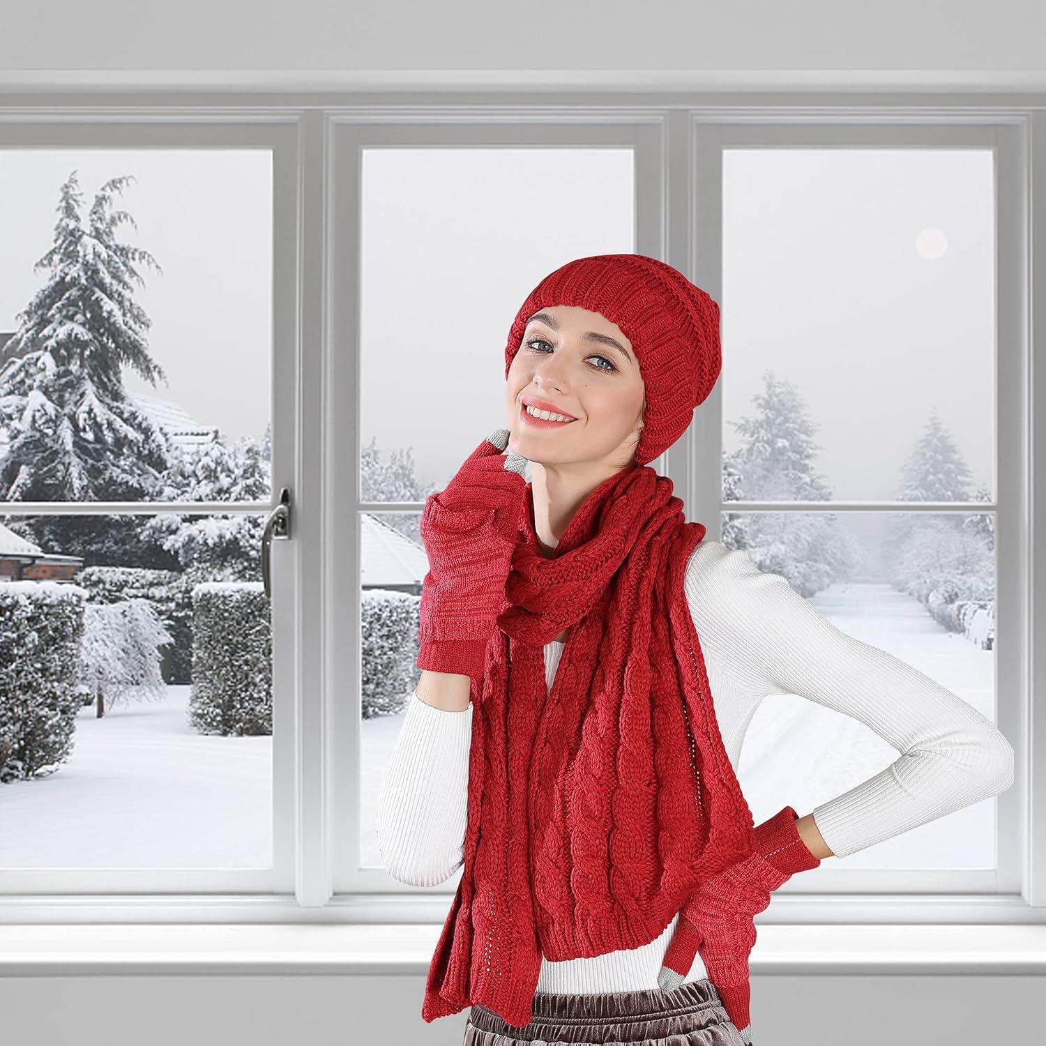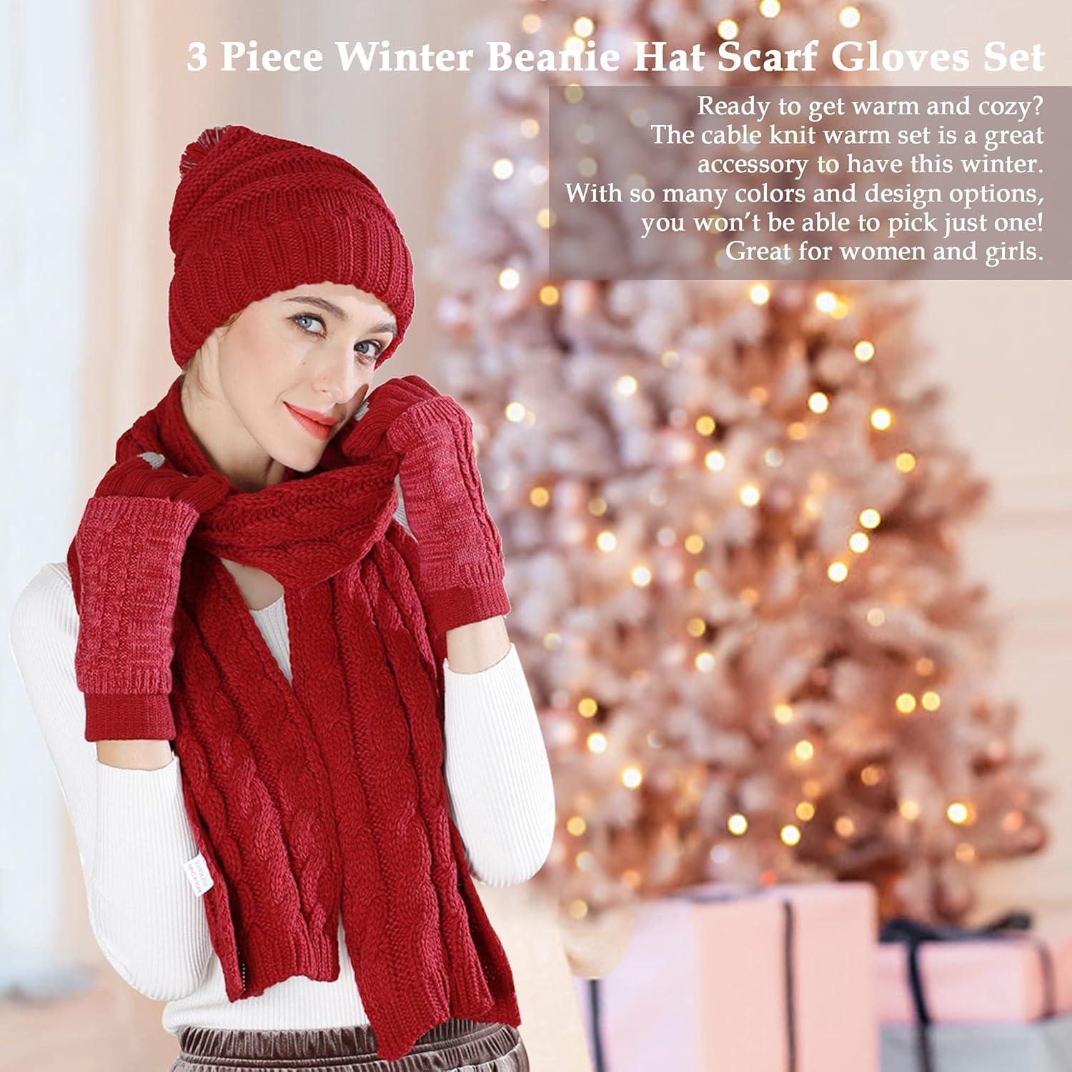 Winter Scarf Gloves and Hat Set for Women, Beanie Hat Long Scarf Touchscreen Gloves, Warm 3 in 1 Set for Womens Girls(Wine Red)